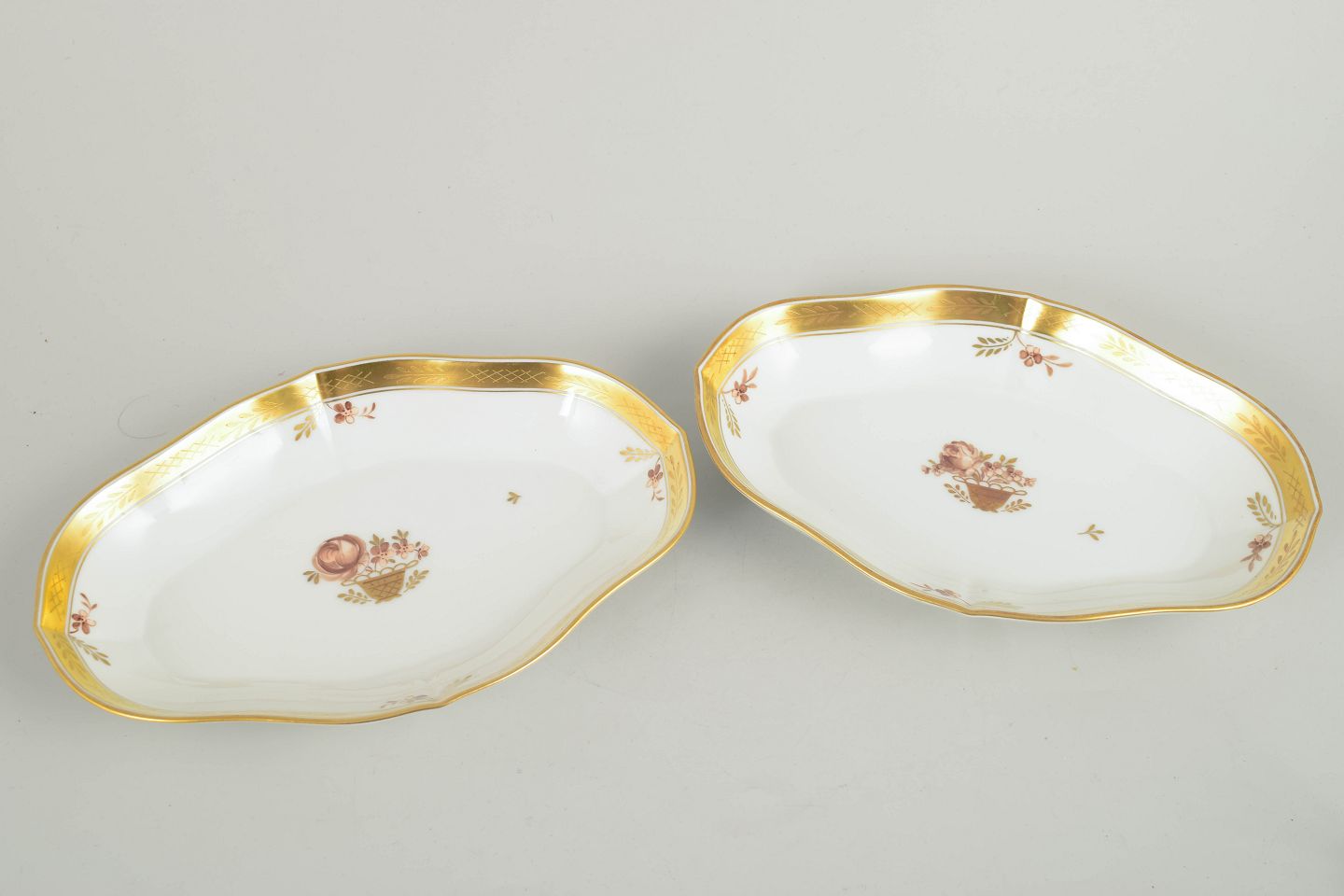 Sæt med to elegante kagefade i porcelæn fra Royal Copenhagens “Guldkurv”-serie, model 595/9626. Begge i 1. sortering med forgyldte kanter og håndmalede blomsterdekorationer.