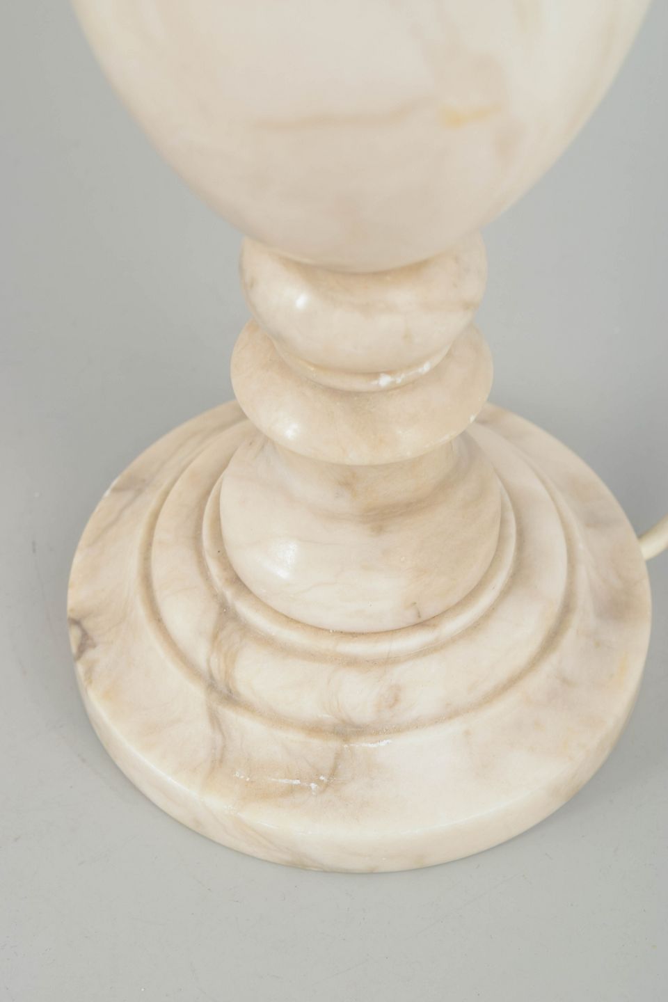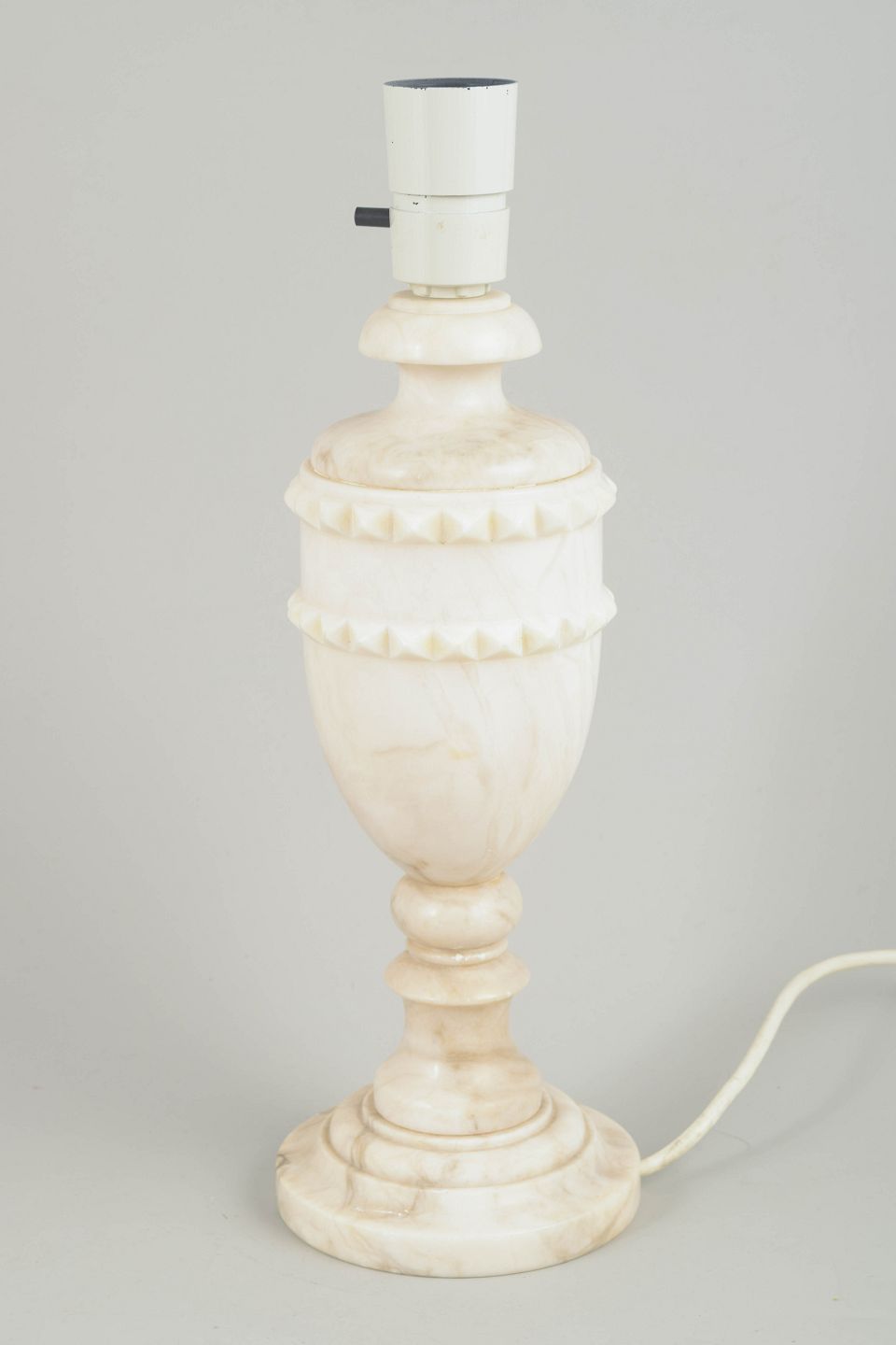 Skulpturel bordlampe i lys marmor med dekorativt bånd af små udskårne takker omkring det øvre midterparti. Den klassiske urneform kombineret med den runde fod giver lampen et blødt, harmonisk og dekorativt udtryk.