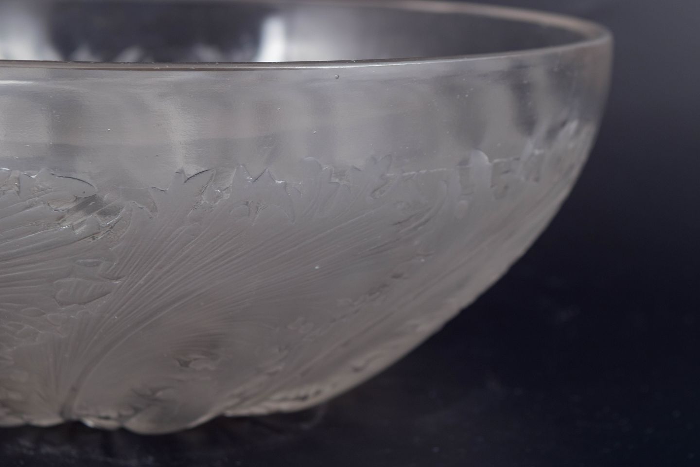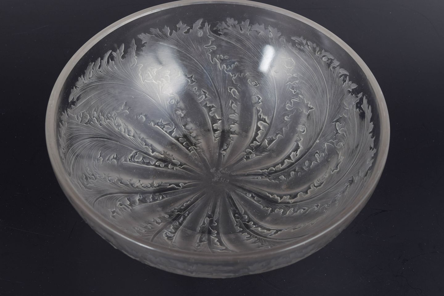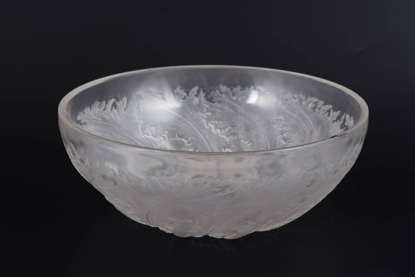 Art Deco skål i frosted og poleret glas med relief af store, buede fjerblade, et klassisk tidligt Lalique-motiv. Den matte og klare overflade skaber en elegant kontrast og fremhæver skålens skulpturelle dybde.