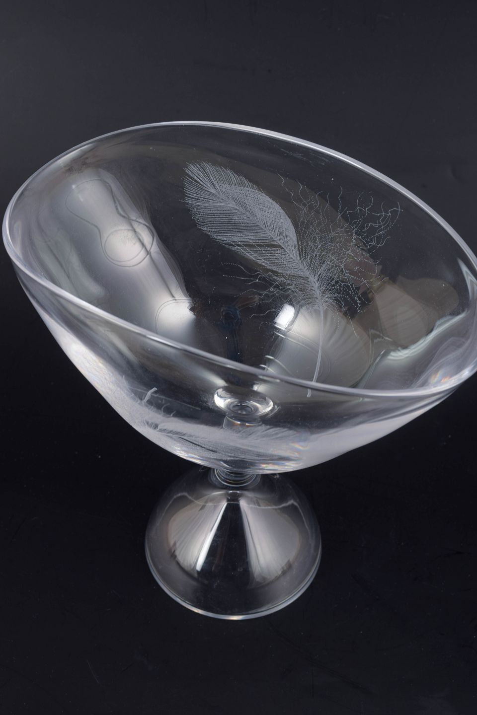 Elegant skål på fod med indlagte fjerlignende dekorationsstrøg i glasset. Motivet er et klassisk dekorativt element anvendt af Kosta. Den asymmetriske form og den høje, dobbeltformede fod giver skålen et moderne og skulpturelt udtryk.