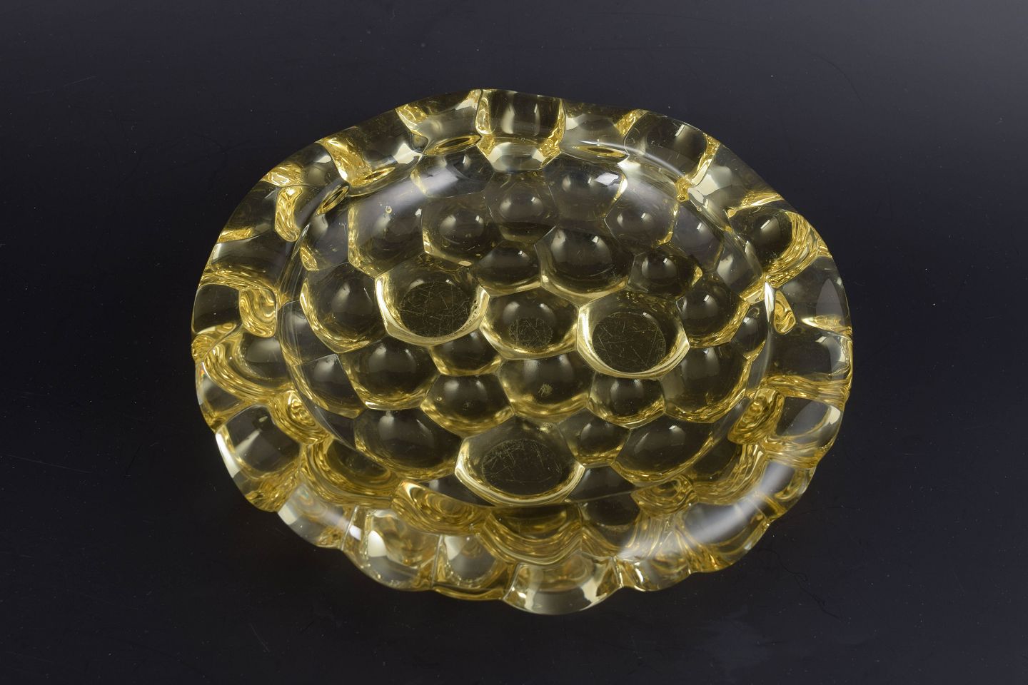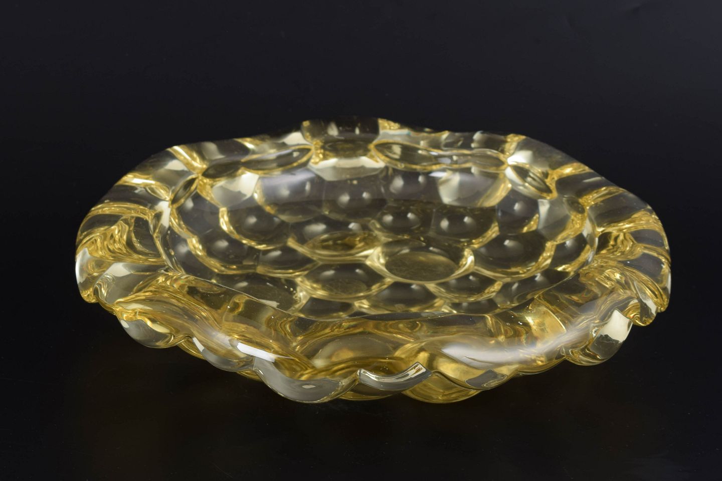 Sjælden gul skål i presset glas med typisk Art Deco-ornamentik og organiske, bølgede former omkring kanten. Pierre d’Avesn arbejdede med markante relieffer og klare geometriske strukturer, hvilket ses tydeligt i dette dekorative og eftertragtede eksempel.