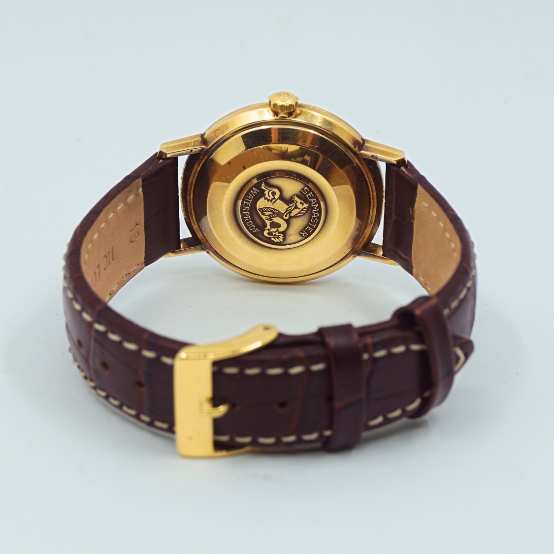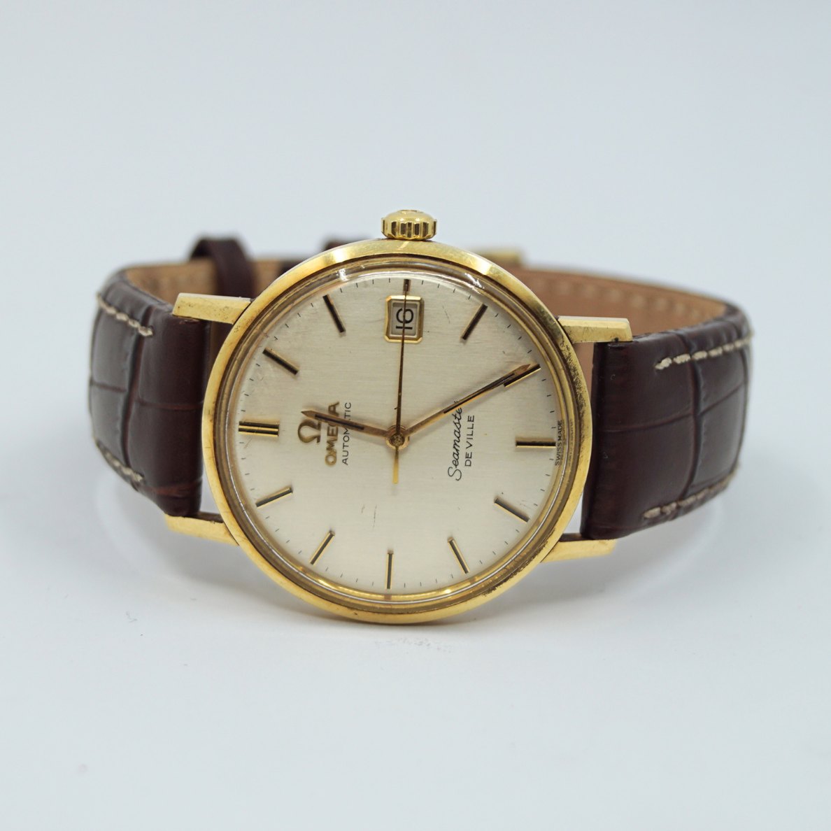 Omega armbåndsur, model Seamaster De Ville i stål med guld. Ref. 166-020. Cal: 562-1. Omega herreur årgang 1968. Automatic. Diameter 34 mm. Med brun læderrem. Original æske medfølger.