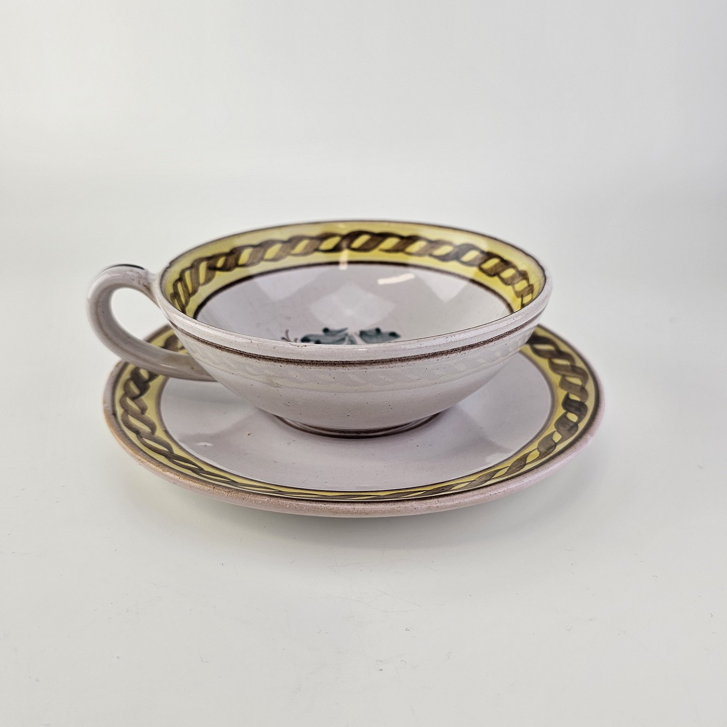 Kop og underkop i keramik med gule detaljer og blomsterdekoration