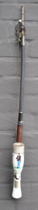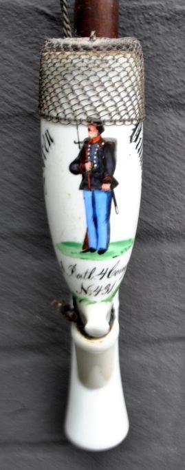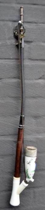 Dansk porcelæns soldaterpibe, 1878, København. Bemalet hvidt porcelæn. Bemalet med teksten: Søren Villadsen, 8 Batl. 4 Comp. N: 431. Erindring fra lejren i Dyrehaven. Med rør af drejet træ og flettet hestehår. Med jerngitter ved pibemunding. Mundstykke af horn. L.: 70 cm.