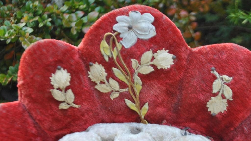 Fransk glas kuppel opsats, c. 1870. Globe de mariée. Indvendig med stol i rødt plyds og silke med pålagte bemalede blomster i metal. Sæde i hvidt plyds med små metal stjerner. Stole højde.: 30 cm. B.: 31 cm. Glasklokke på træfod. H: 43 cm.