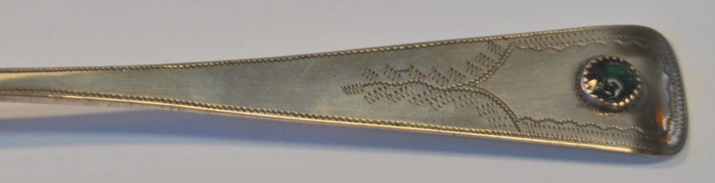 Peter Johannesen Petersen (1805 - 1873) Aabenraa, Danmark: Sølvske med grøn glasflus. Stemplet. L.: 23 cm. Med graveringer på skaft. Med gravering: J. Jepsen, Eken den 9.9.1897.