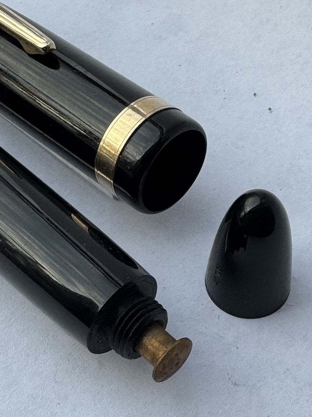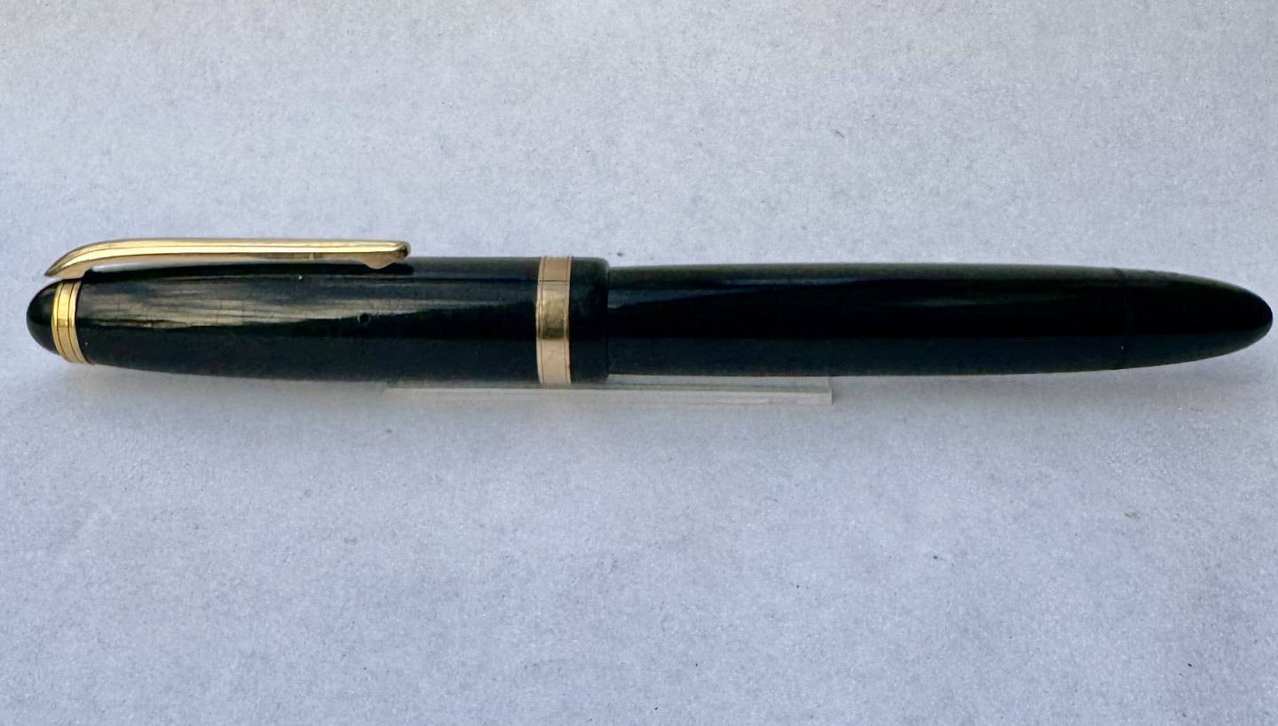 Sort Montblanc no. 216 fyldepen. Push button blæk-påfylder. Fremstillet i Tyskland. i 1950´erne. Fremstår i god stand uden skader eller reparationer. Alle originale Montblanc dele inclusive den flotte 14 karat guldspids. Der skal indsættes en ny gummisæk så pennen igen kan optage blæk og skrive igen. Mål: Længde 13,7 cm.