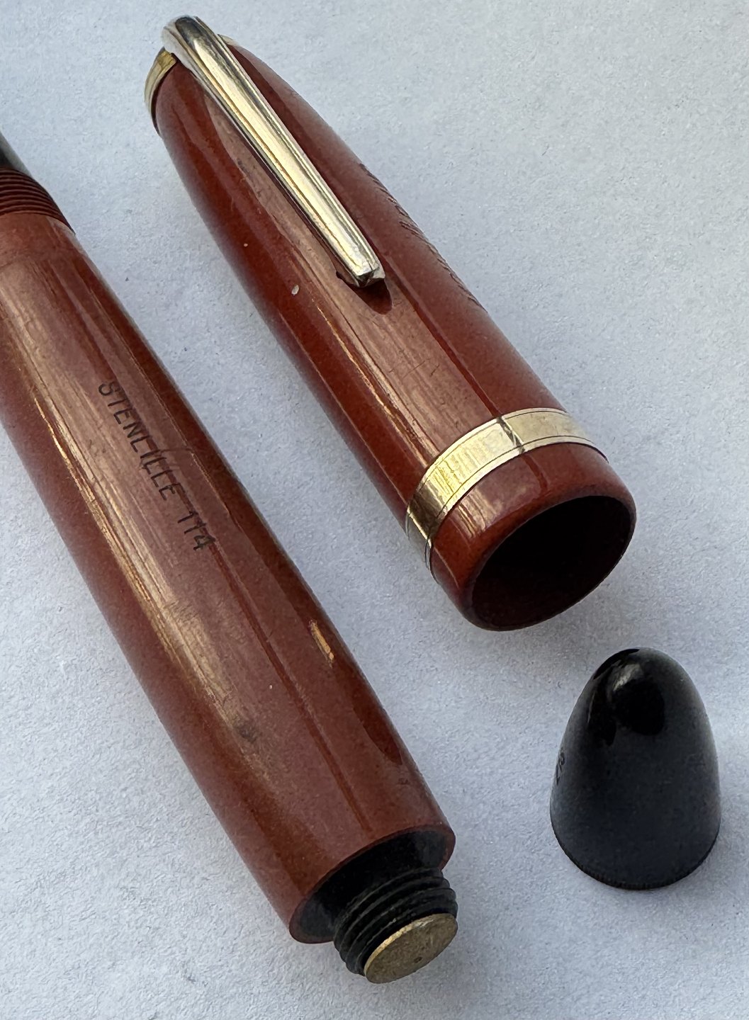 Koral rød Montblanc nr. 216 fyldepen. Push button filler. Fremstillet I Tyskland i 1950’erne. Fremstår I god stand uden skader eller reparationer. Alle dele originale Montblanc fra produktionsperioden med bl.a flot nr. 6 spids i 14 karat guld. Indgraveret STENLILLE 114 på siden af pennen. L.13,8 cm
