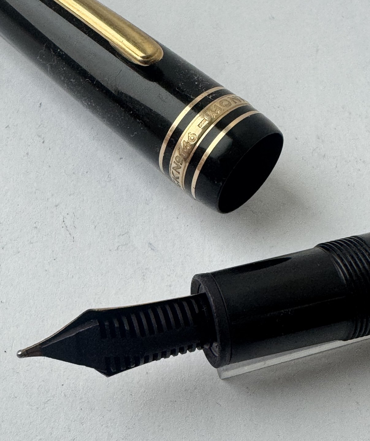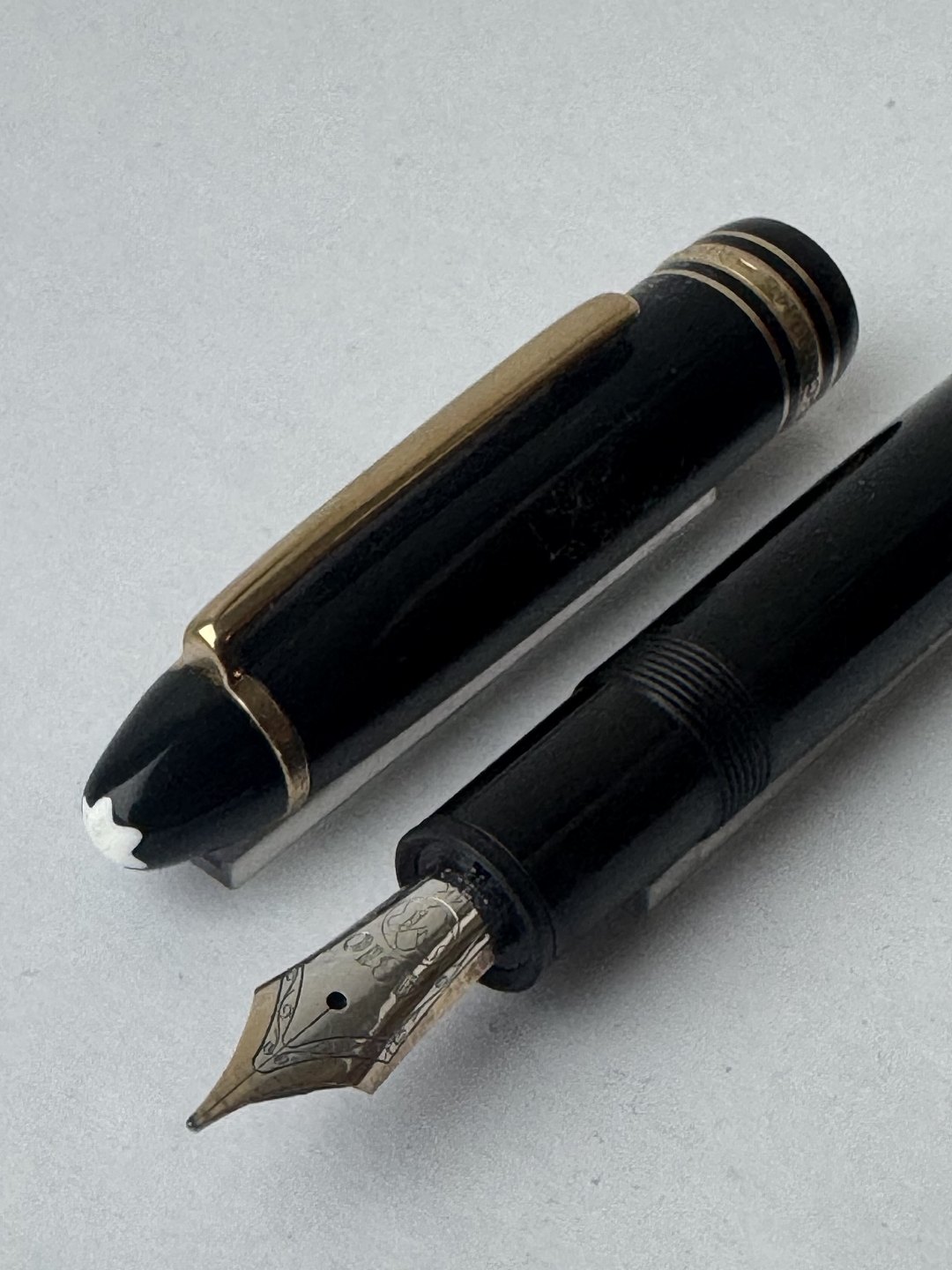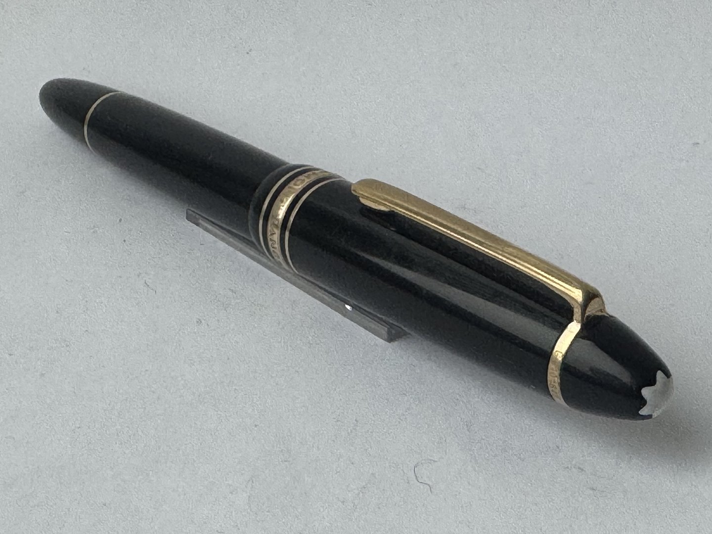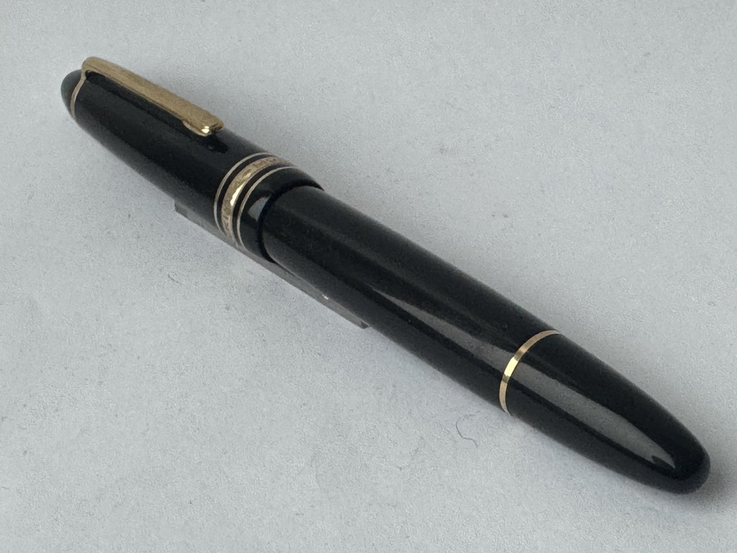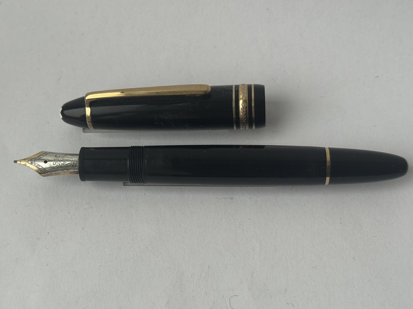 Sort Montblanc Meisterstück LeGrand fyldepen med alle originale Montblanc dele inklusiv en stor guldspids i 14 karat. Blækpåfyldning med piston filler. I god stand og klar til at blive brugt. L. 14,3 cm.