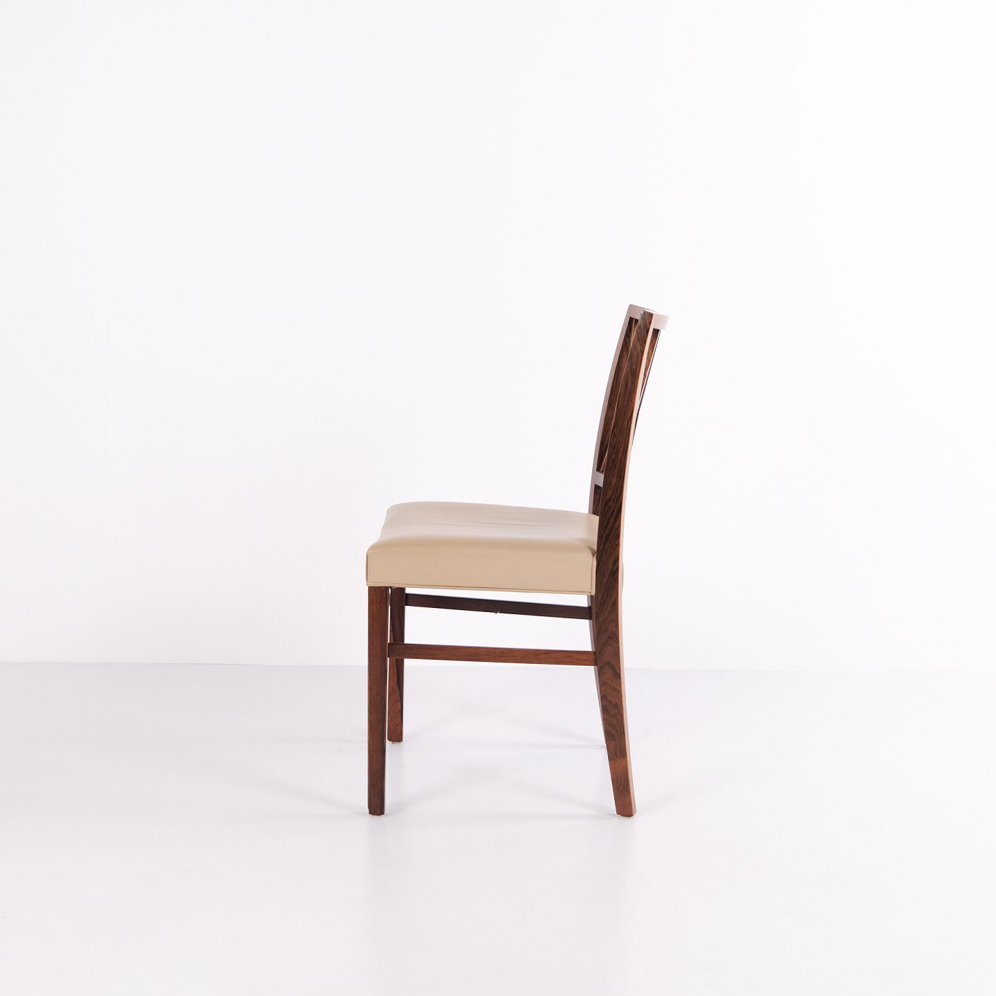 Sæt af fire spisebordsstole af Ole Wanscher for A.J. Iversen. Palisander og cremefarvet læder. Dansk design fra 1960’erne.