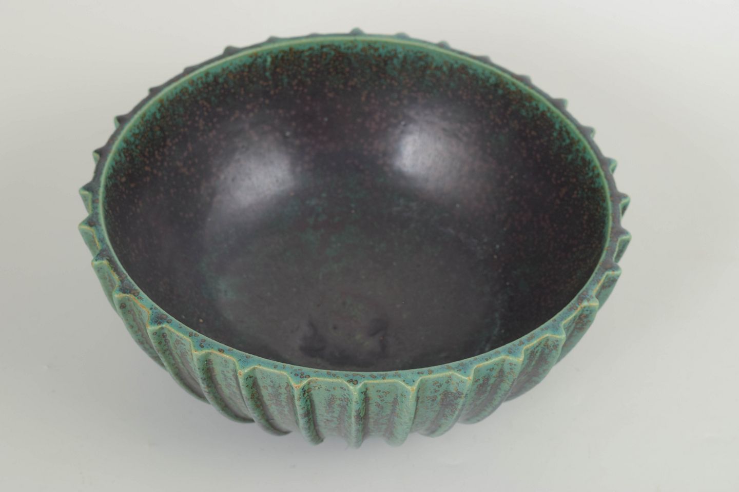 Kraftfuldt formet Art Deco-skål i stentøj med markant lodret rifling og dyb, grøn løbende glasur over mørk bund. Formen er både monumental og balanceret, karakteristisk for Arne Bangs arbejder fra 1940’erne, hvor håndværk og skulpturel tyngde forenes.