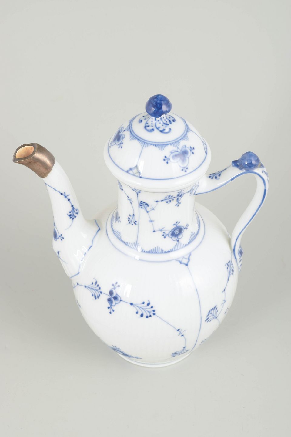 Musselmalet riflet kaffekande med sølvmontering på tuden, ca. 1920’erne.