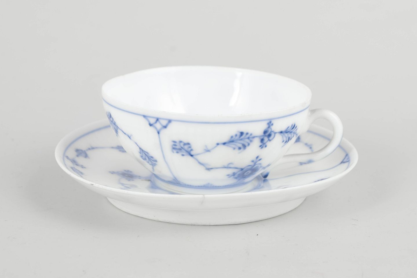 Antik kaffekop med tilhørende underkop i Musselmalet Riflet. Koppen er udført i den klassiske riflede form uden blondekant og dekoreret med håndmalet koboltblå underglasur i det ikoniske musselmalede mønster. Et tidligt og raffineret eksempel på Royal Copenhagens kaffestel fra slutningen af 1800-tallet.