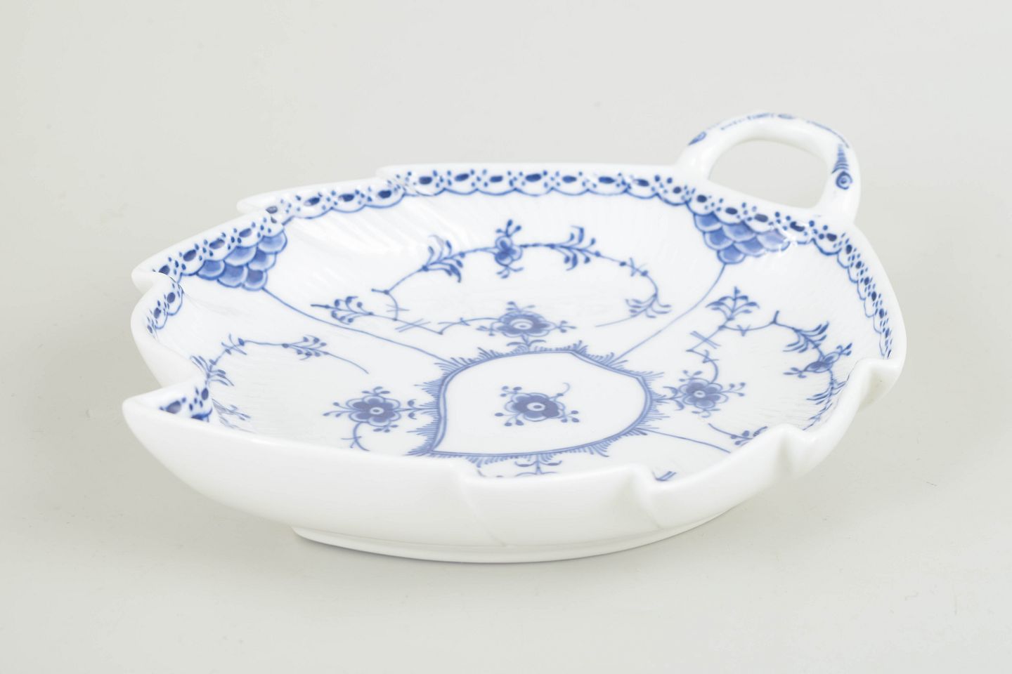 Dekorativt fad med hank i Musselmalet halvblonde. Den organiske, bladformede kontur med gennembrudt blondekant kombineres med den klassiske håndmalede koboltblå dekoration. Et elegant serverings- eller anretningsfad, velegnet til mindre retter, kager eller som del af et større stel.