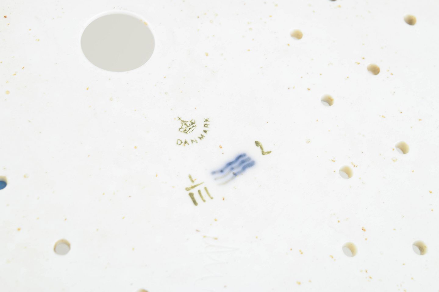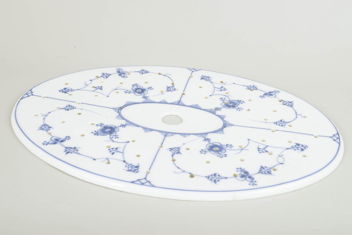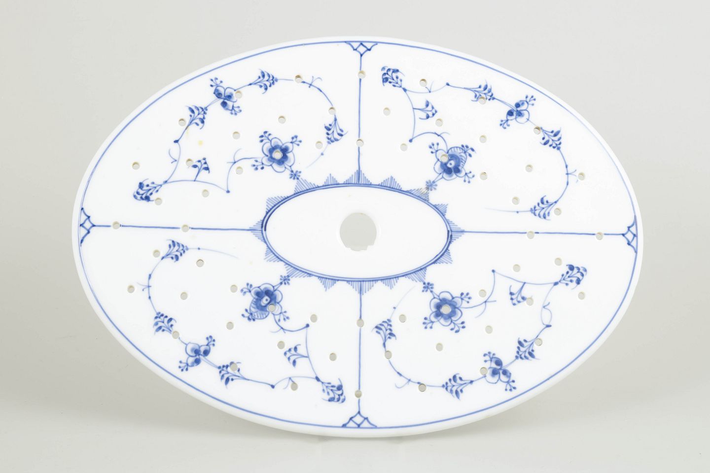 Antik fiskerist i klassisk Musselmalet Riflet-dekoration. Den ovale, riflede form er opdelt af fine gennembrudte felter og dekoreret med håndmalet koboltblå underglasur i det karakteristiske musselmalede mønster. Et både funktionelt og elegant serveringsstykke fra Royal Copenhagens tidlige produktion, udført med stor teknisk kunnen og harmonisk balance.