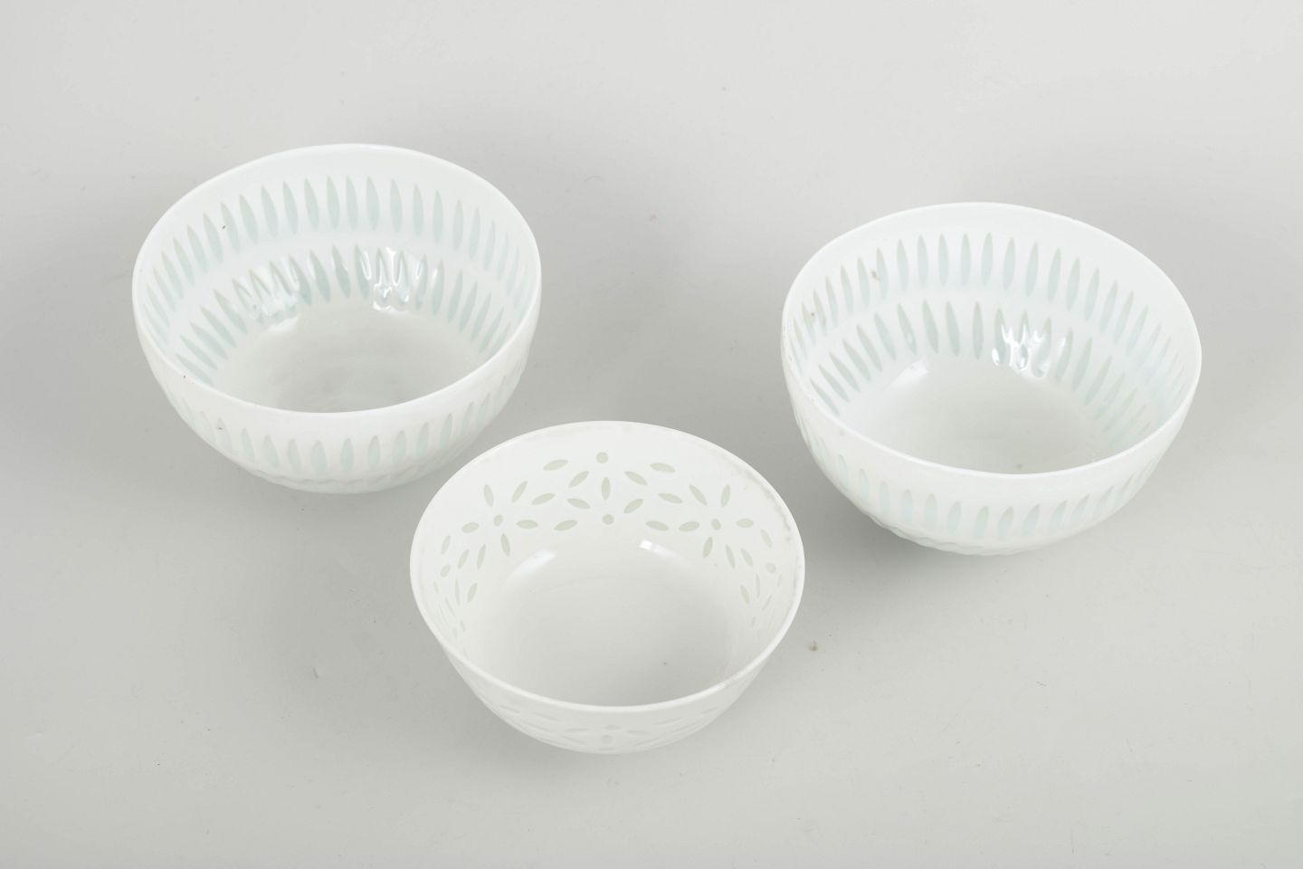Sæt bestående af tre små skåle i hvidt porcelæn med gennembrudt og præget dekoration i klassisk “rice porcelain”-udtryk. De fine perforeringer og transparente glasurfelter giver skålene et let og næsten translucent præg, mens de enkle, koniske former understreger Friedl Holzer-Kjellbergs raffinerede modernistiske formsprog.