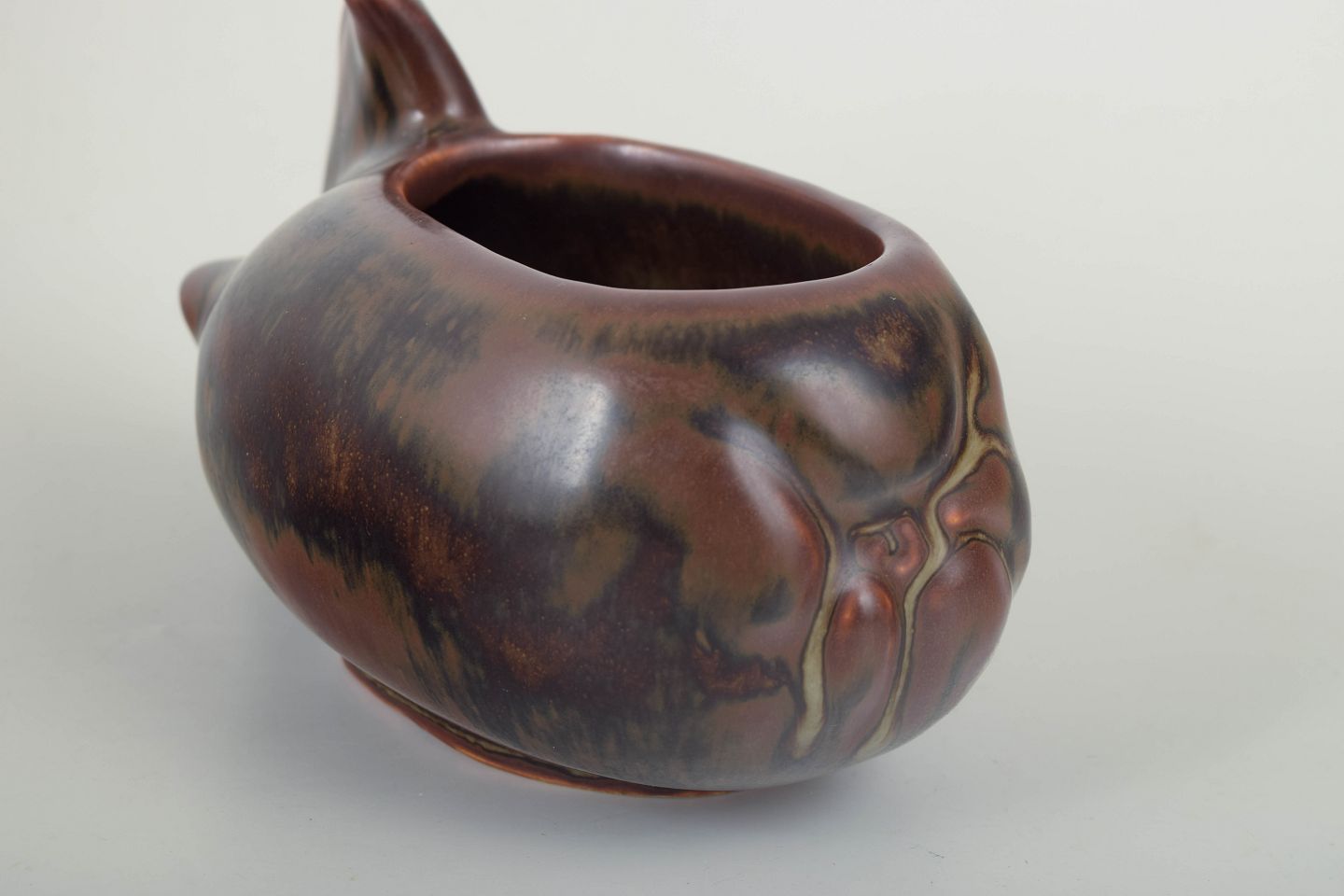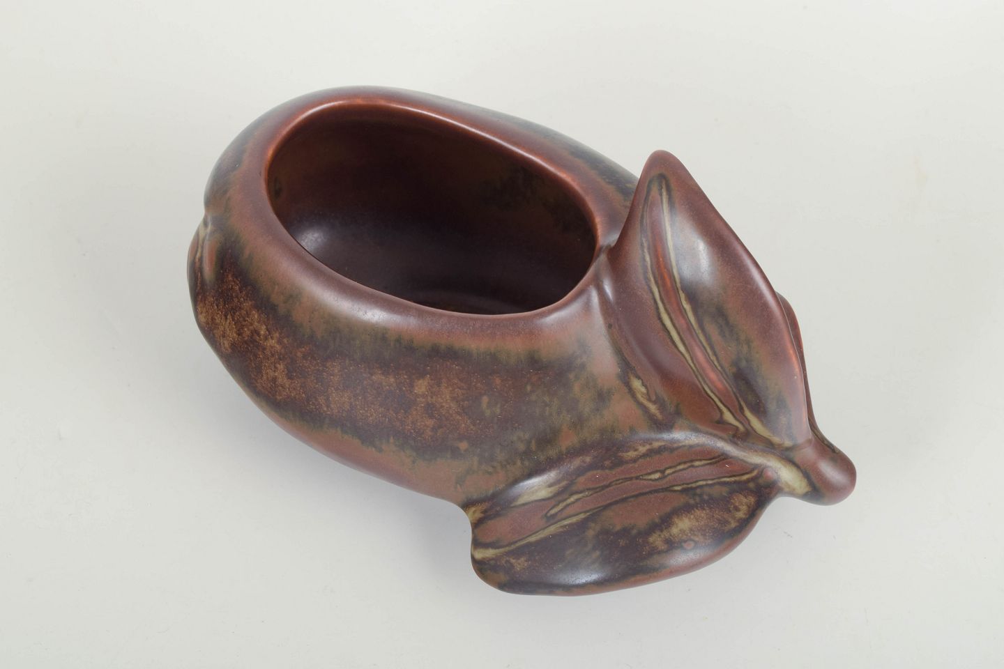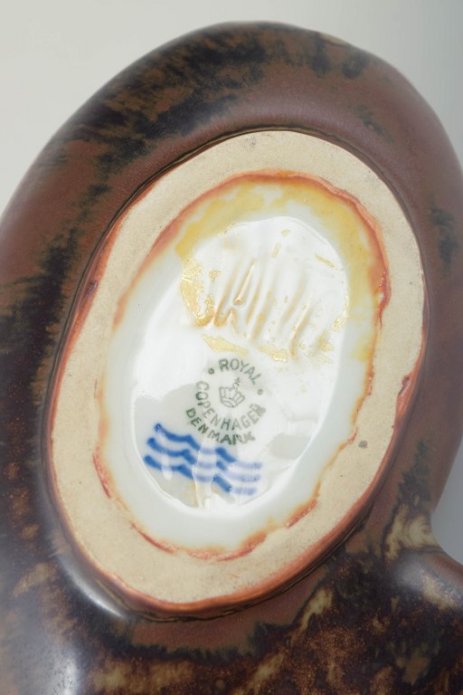 Organisk og frit formet stentøjsskål med markant asymmetrisk, biomorf udformning, typisk for Axel Saltos eksperimenterende og skulpturelle formsprog. Den kraftige, plastiske form kombineres med en dyb, levende glasur i brunlige og violette nuancer med fine farvespil, som understreger objektets kunstneriske karakter.