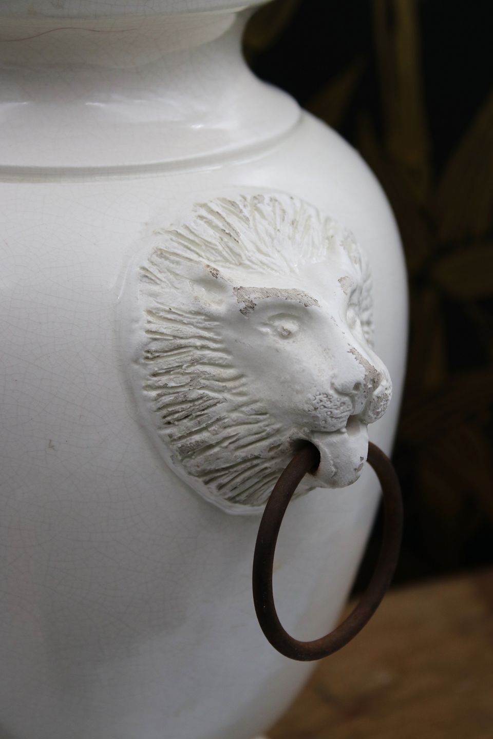 Gammel glaseret stentøjs lågkrukke med løvehoveder på siden.