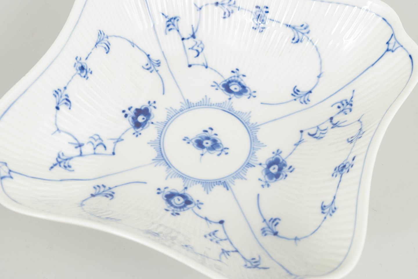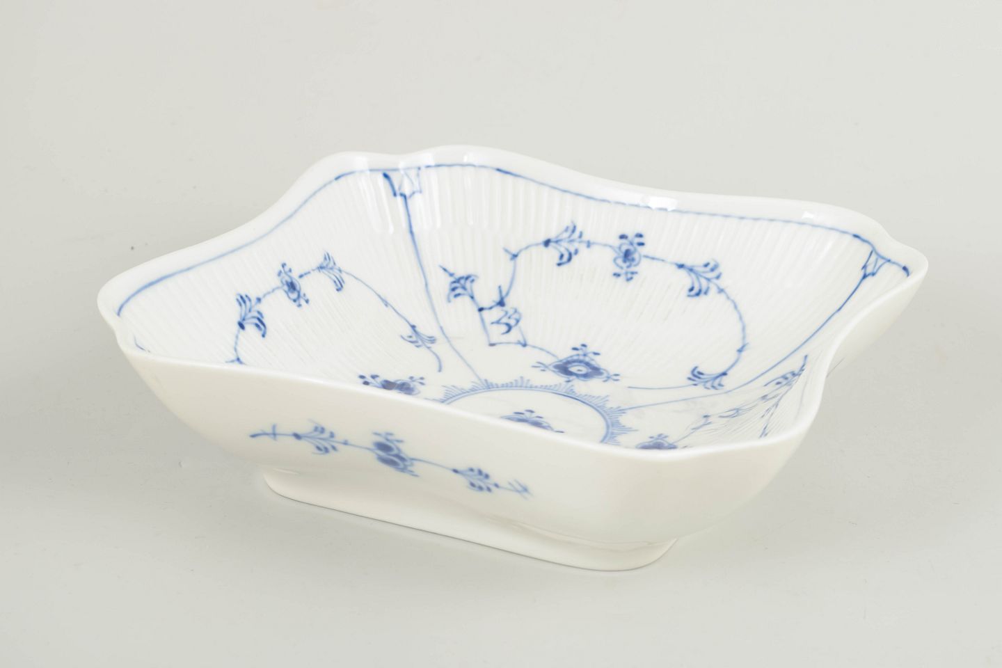 Markant firkantet skål i Musselmalet Riflet, udført i klassisk riflet form med let bølget kant og dekoreret med håndmalet koboltblå underglasur. Skålen er opdelt i fire felter omkring et centralt spejl og fremstår som en karakterfuld og relativt sjældent forekommende serveringsmodel i stellet.