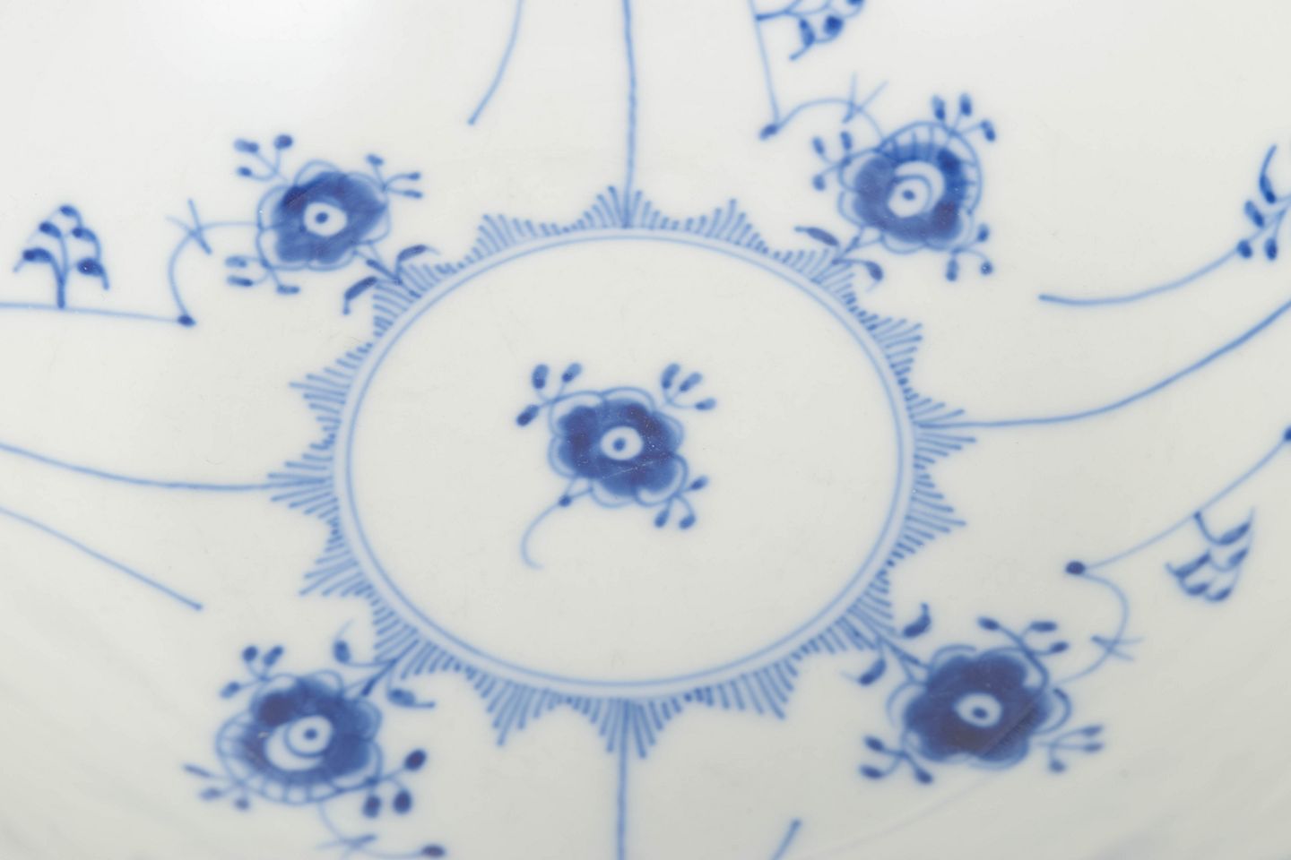Sjælden skål i Musselmalet Riflet, udført i klassisk riflet form og dekoreret med håndmalet koboltblå underglasur. Skålen har en let bølget rand og fremstår som en mindre almindelig model inden for stellet, velegnet både til servering og som dekorativ del på bordet.