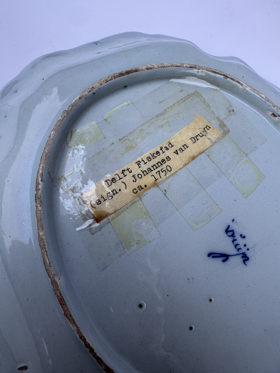 BLÅ BLOMSTER DEKORATION: Delft fajance fiskefad fra den nederlandske fabrik van Duyn fremstillet omkring 1765. Fremstår i god stand med alders relaterede brugsspor rundt på kanten i form af små overflade afslag i glasuren (se mange fotos). Der udover ingen skader eller reparationer. Fabriksmærket på bunden samt gammel label med dansk tekst. Mål:H.3,4 cm, L. 23,3 cm, D. 20,9 cm