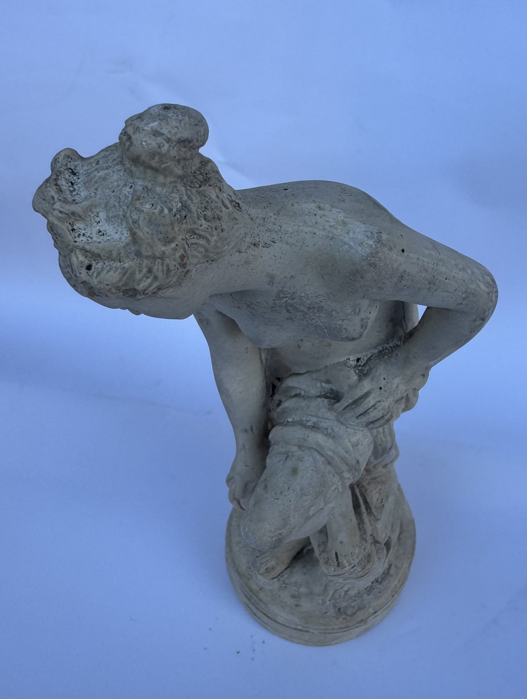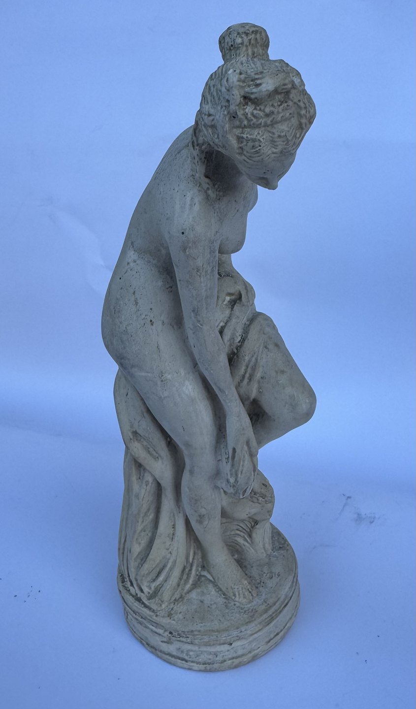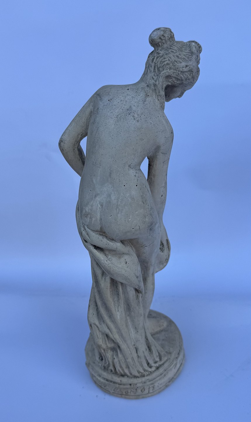 Venus, kærlighedens gudinde, forbereder sig på eller stiger ud af et bad. Skabt af den franske billedhugger Étienne-Maurice Falconets i 1767. Figuren er ofte brugt som havefigur og i mindre stue-venlige udgaver. Er fremstillet i både sten, marmor , keramik, gips og bronze gennem mere end 250 år. Denne figur er udført i gips formentlig i midten af 1900-tallet. Den fremstår i god stand uden skader eller reparationer. 25 cm høj.