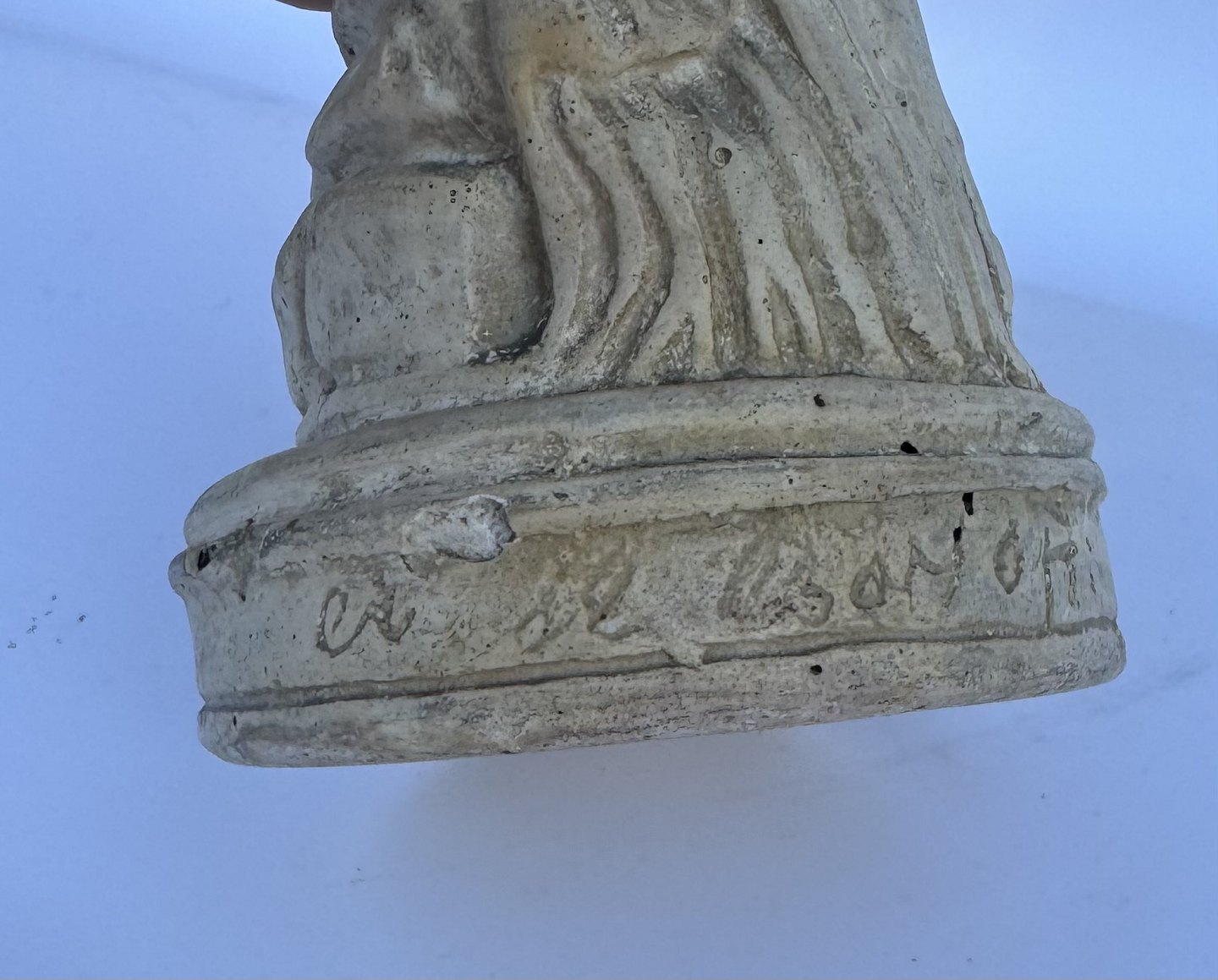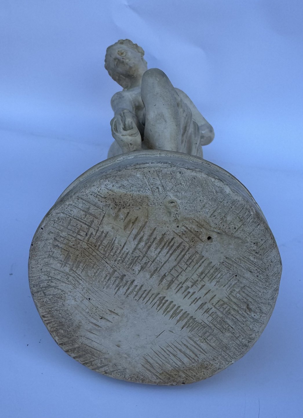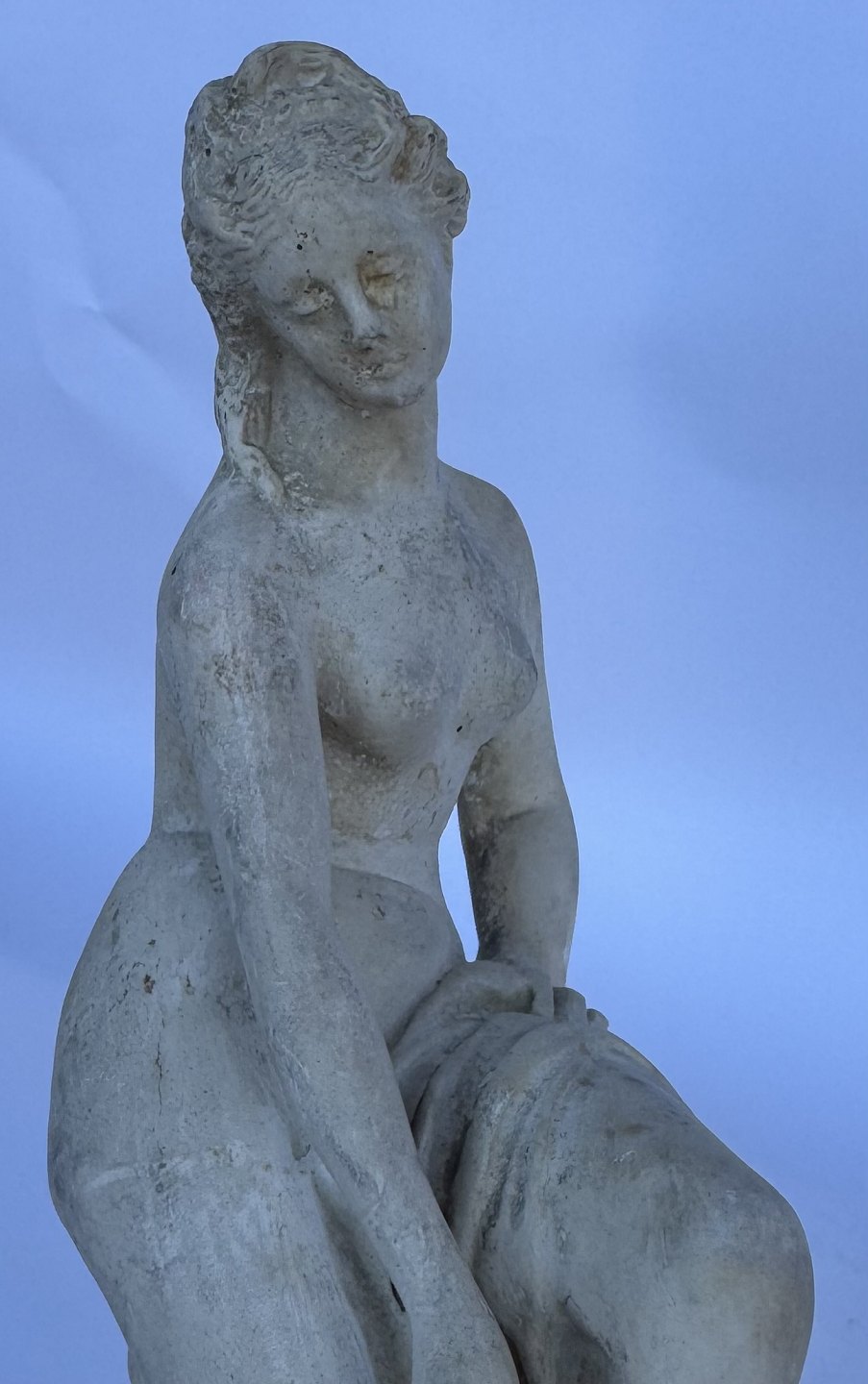 Venus, kærlighedens gudinde, forbereder sig på eller stiger ud af et bad. Skabt af den franske billedhugger Étienne-Maurice Falconets i 1767. Figuren er ofte brugt som havefigur og i mindre stue-venlige udgaver. Er fremstillet i både sten, marmor , keramik, gips og bronze gennem mere end 250 år. Denne figur er udført i gips formentlig i midten af 1900-tallet. Den fremstår i god stand uden skader eller reparationer. 25 cm høj.