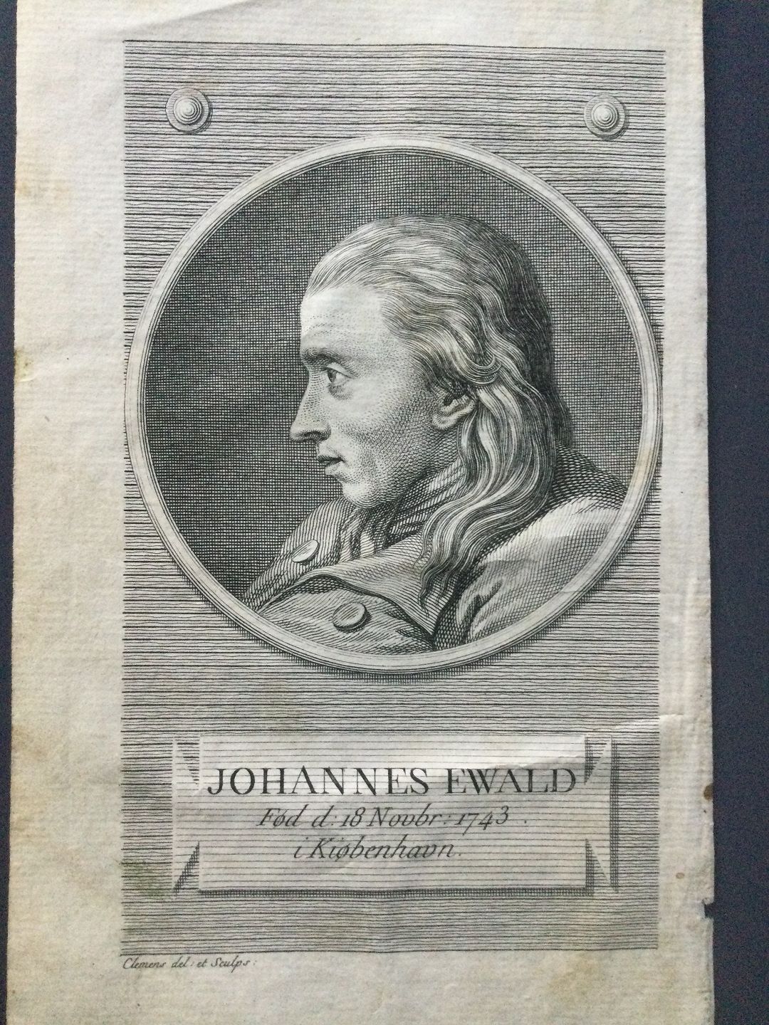 Kobberstik af J.F. Clemens - Portræt af Johannes Ewald.