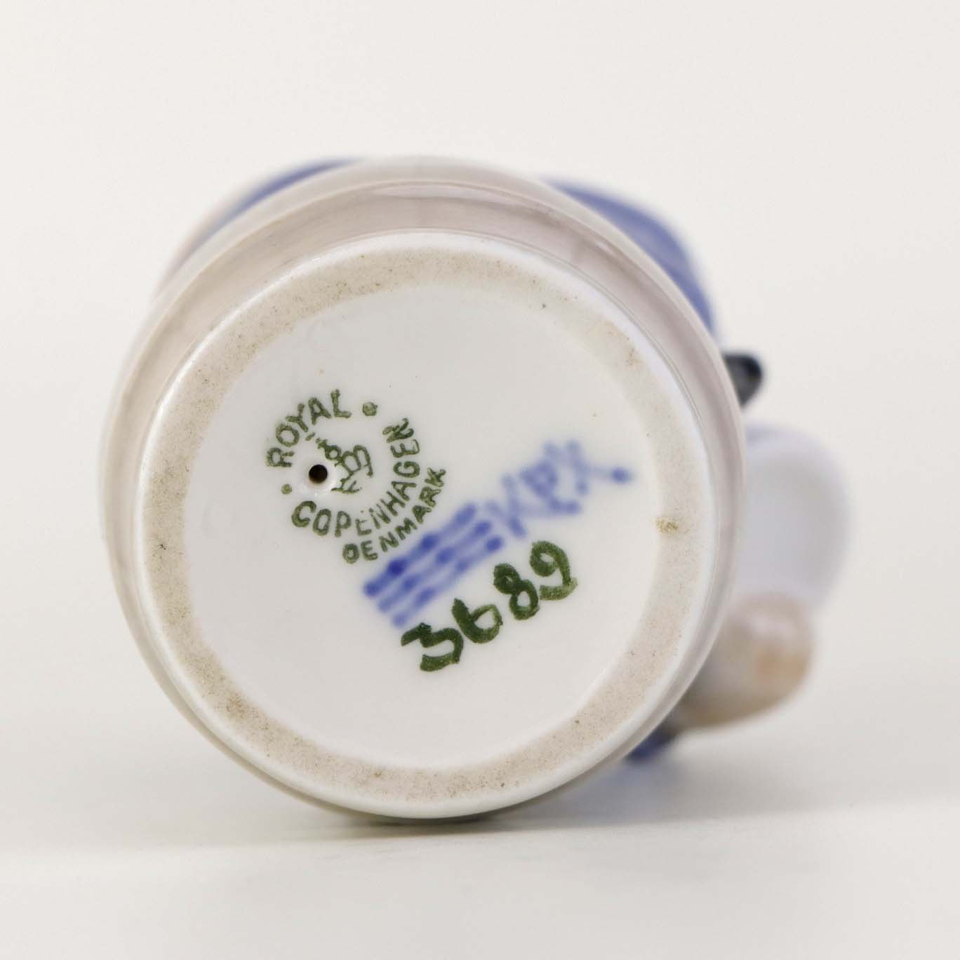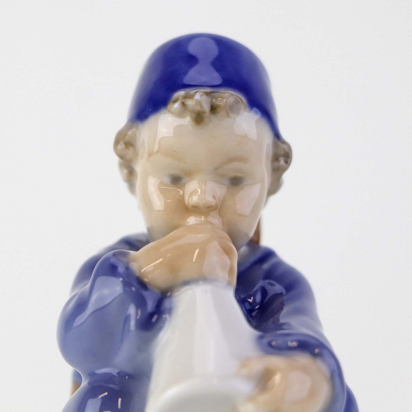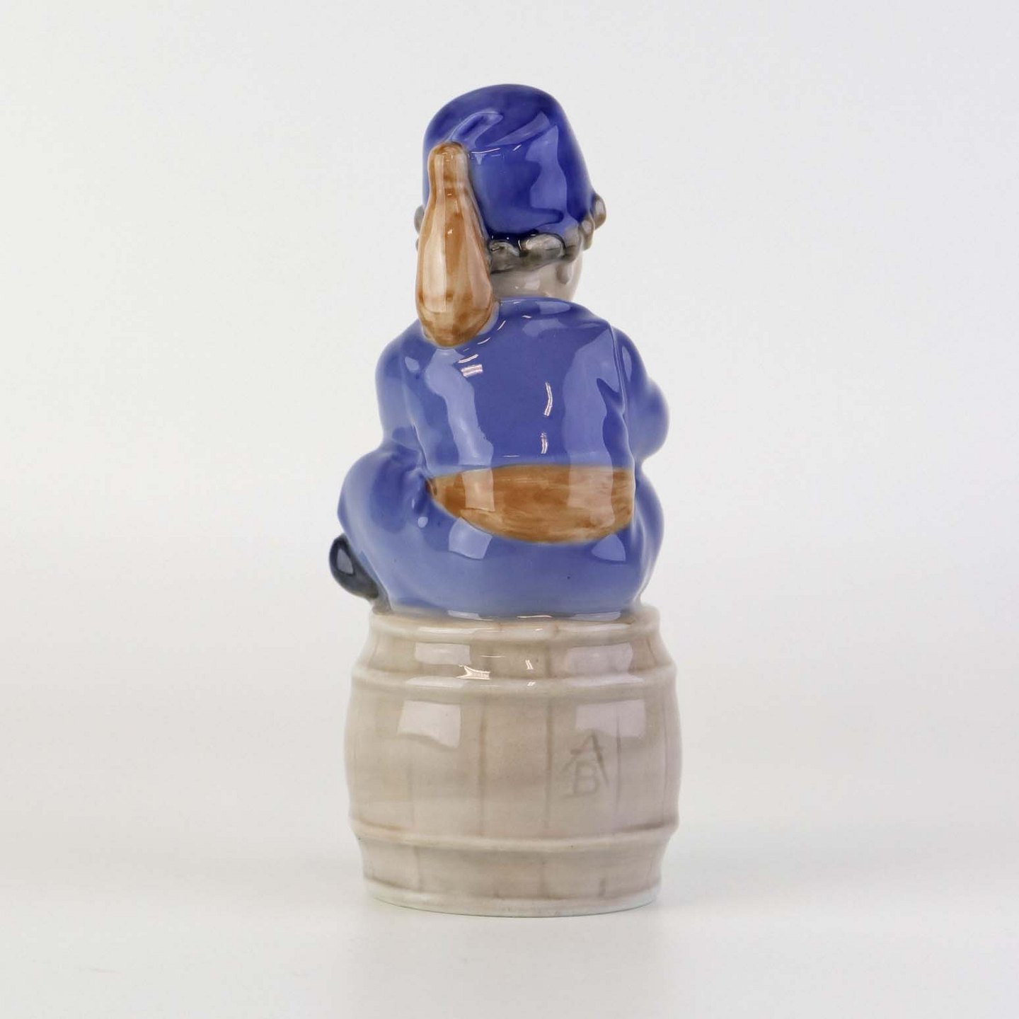 Figur i porcelæn med motiv af siddende dreng på tønde blæsende på et horn. Nr. 3689