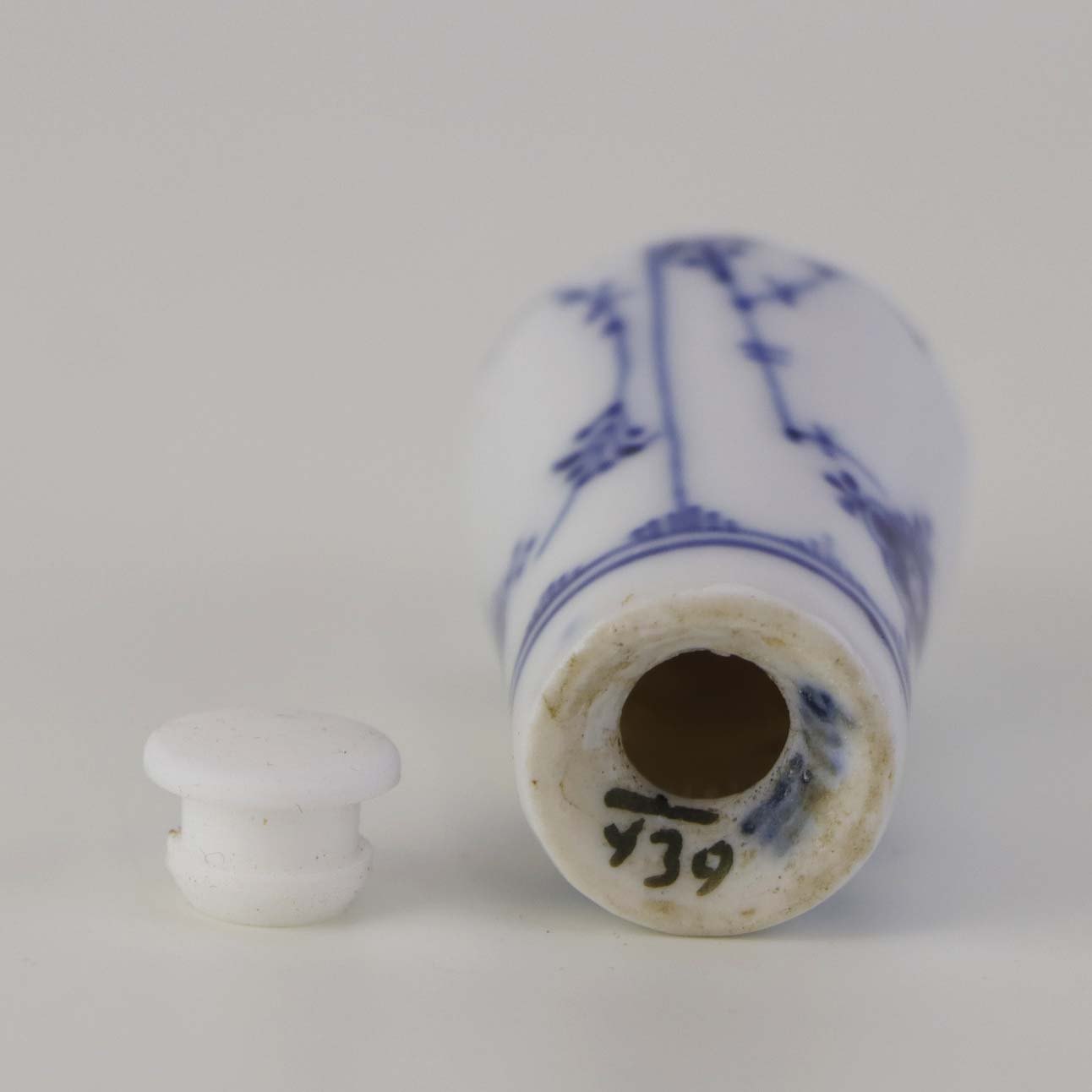 Musselmalet er af kongeligt hvidt porcelæn, dekoreret med rifler og mønster af blå ranker og blomster.
