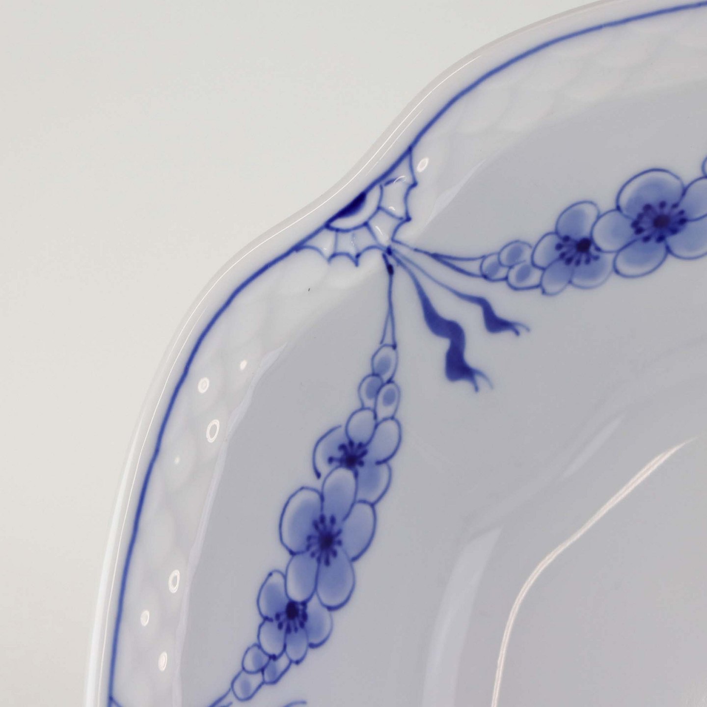 Service i hvidt porcelæn med skelform og motiv af guirlander med blå blomster