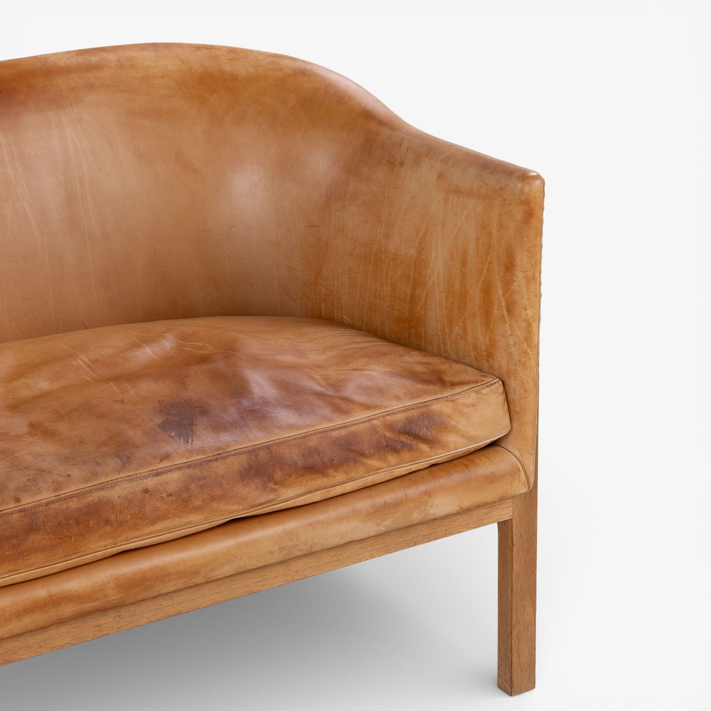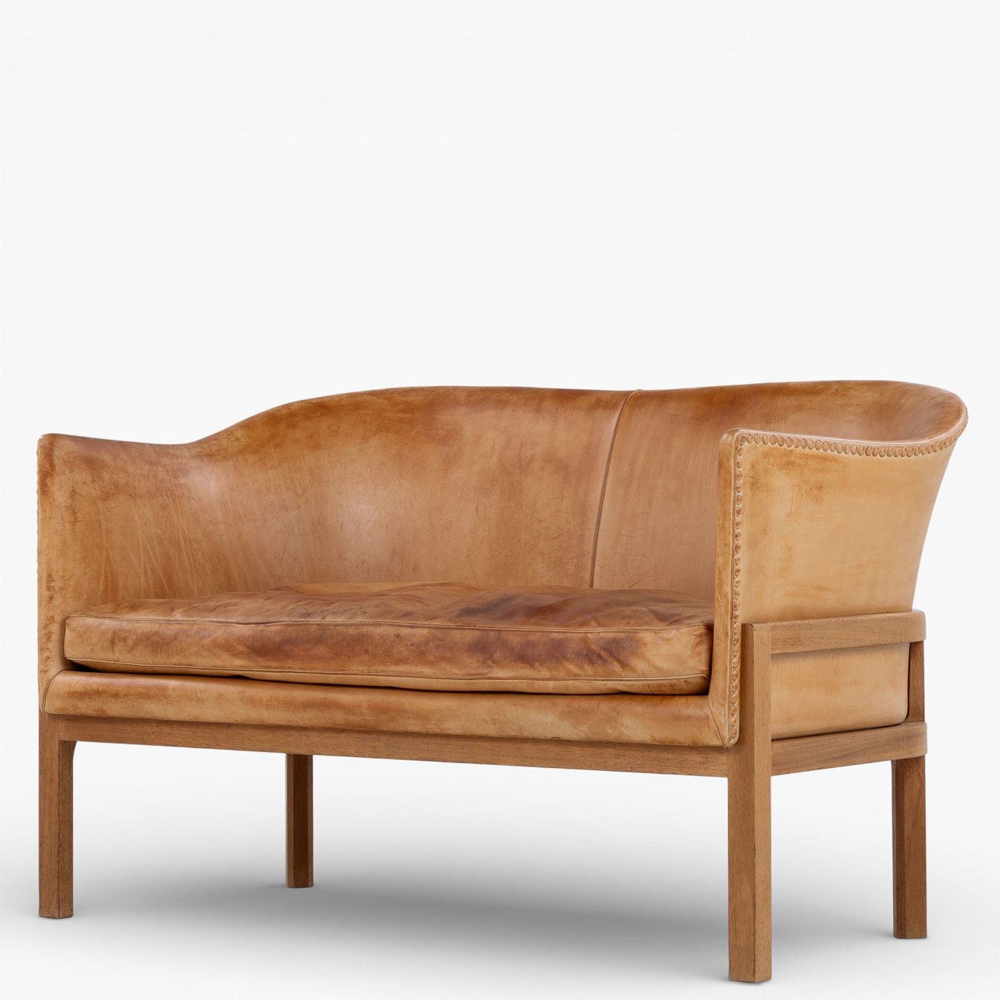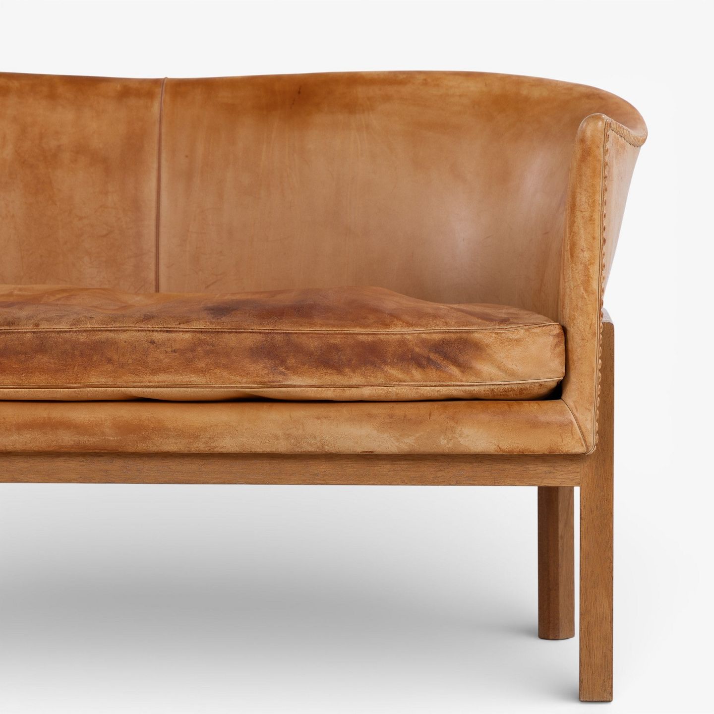 MK 52/2 - 2 pers. sofa i patineret sømbeslået naturlæder med stel i mahogni.