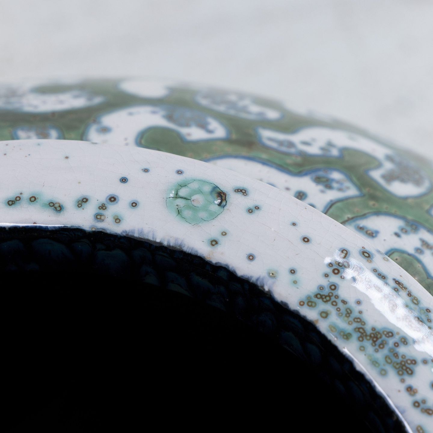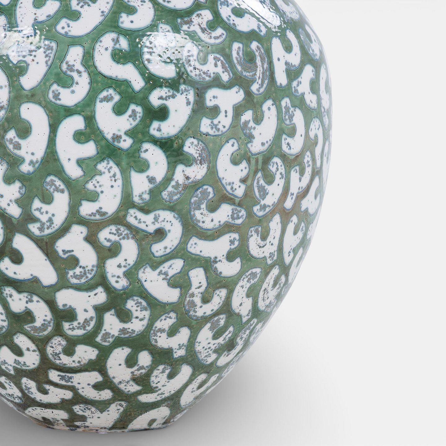 Kolossal krukke i stentøj med grøn glasur og hvide stafferinger. Signeret.