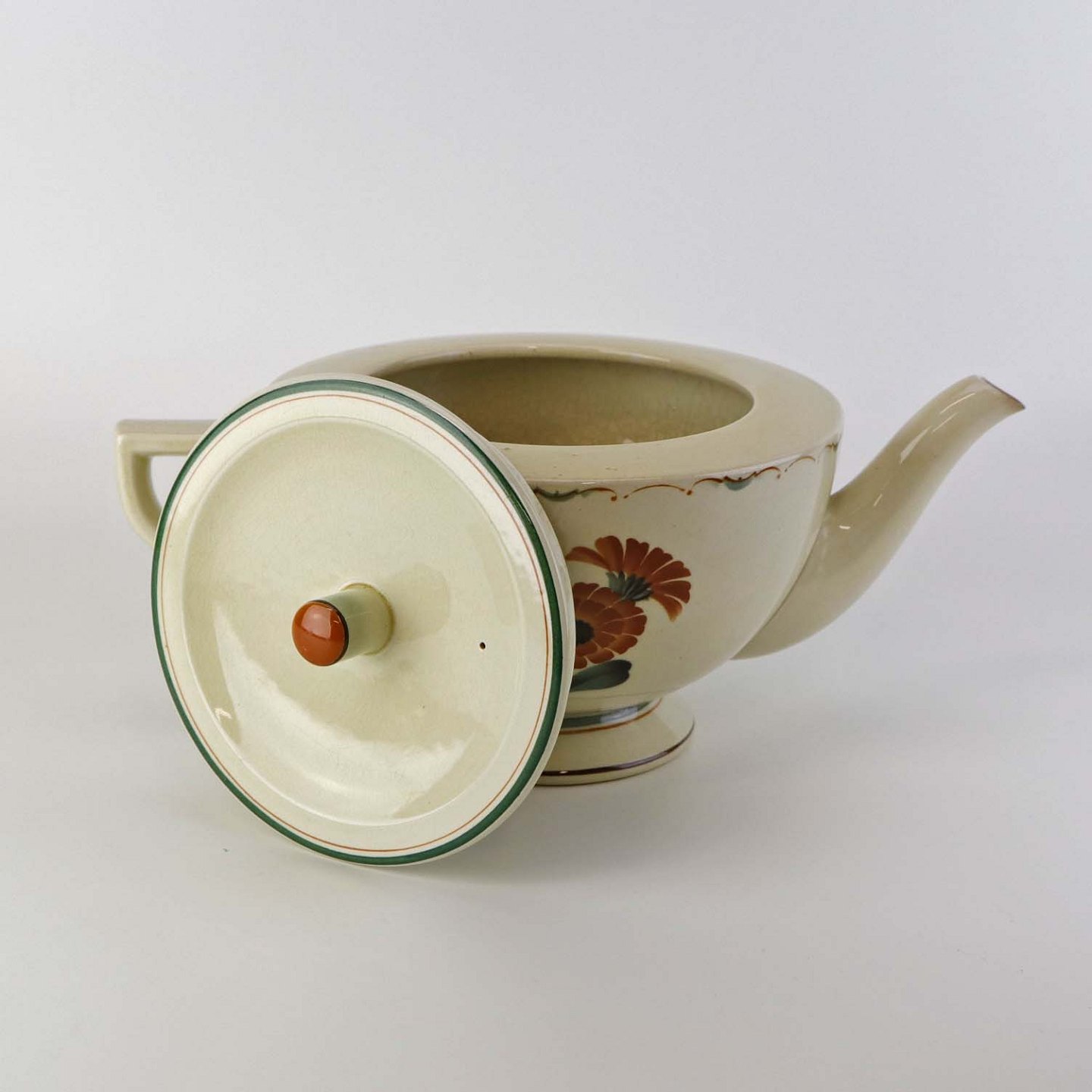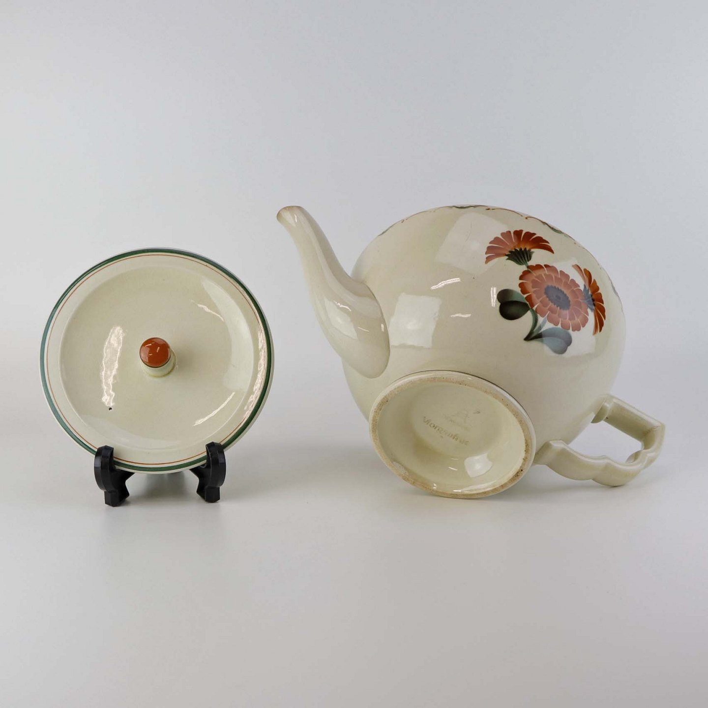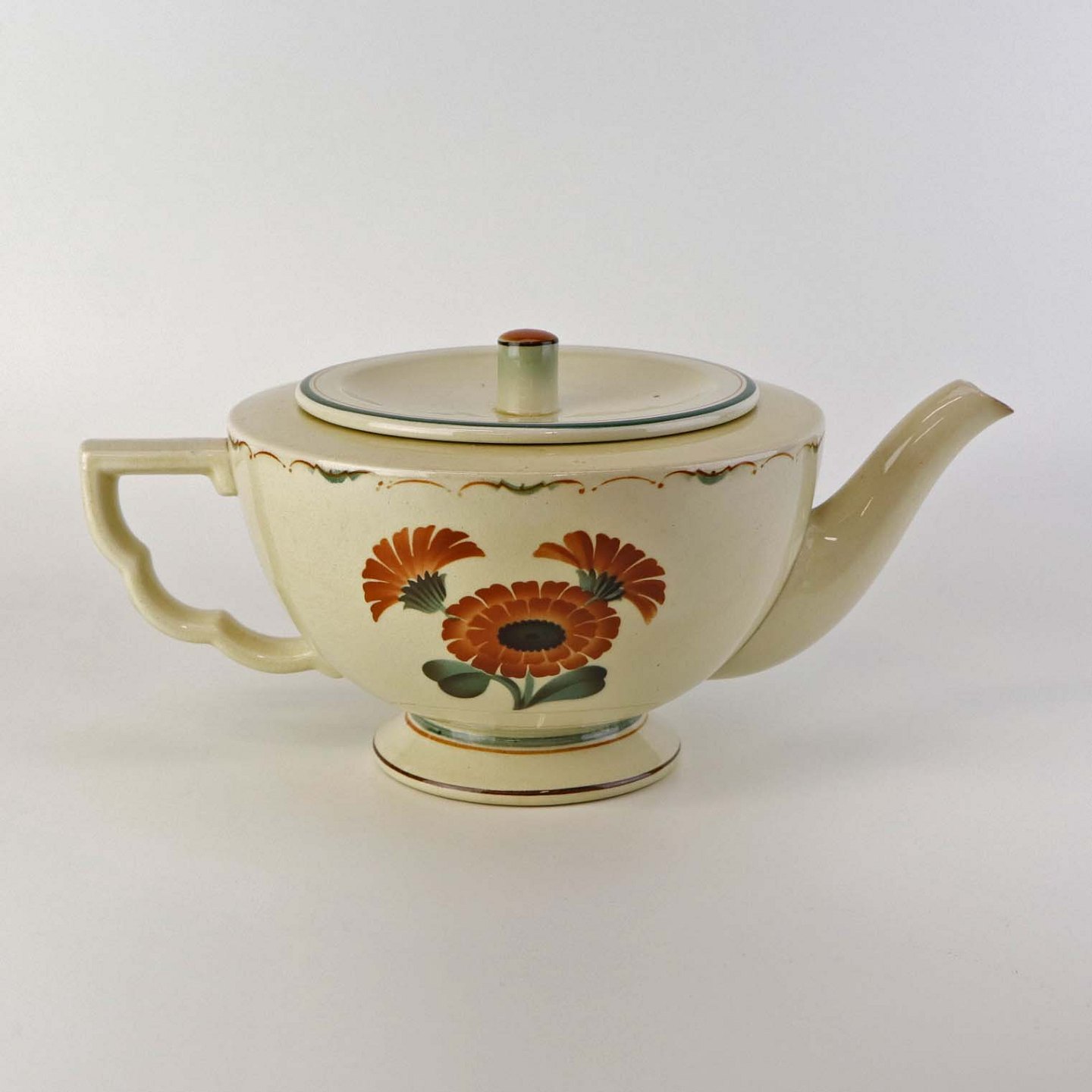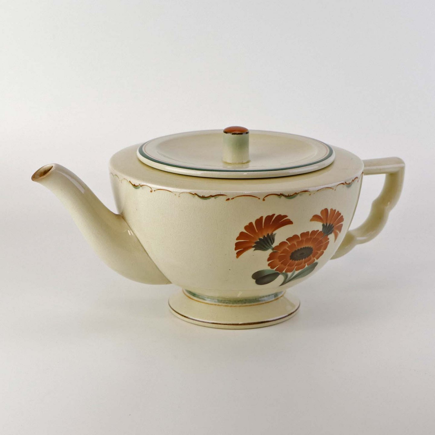 Fajance tepotte med motiv af orange morgenfruer på gul baggrund.