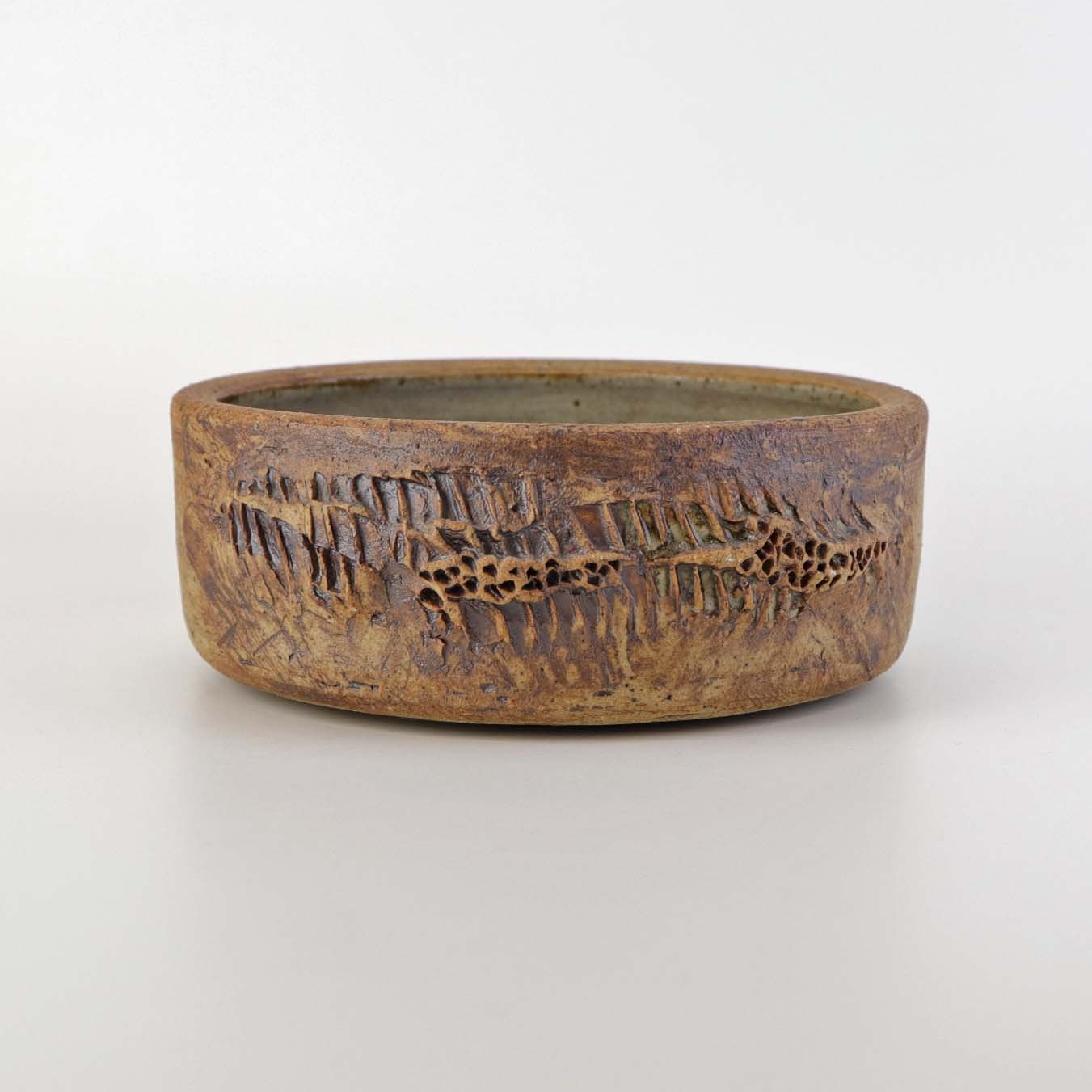Rund skål i keramik med beige, grå og lyseblå glasur på indersiden samt uglaseret abstrakt mønster på ydersiden.