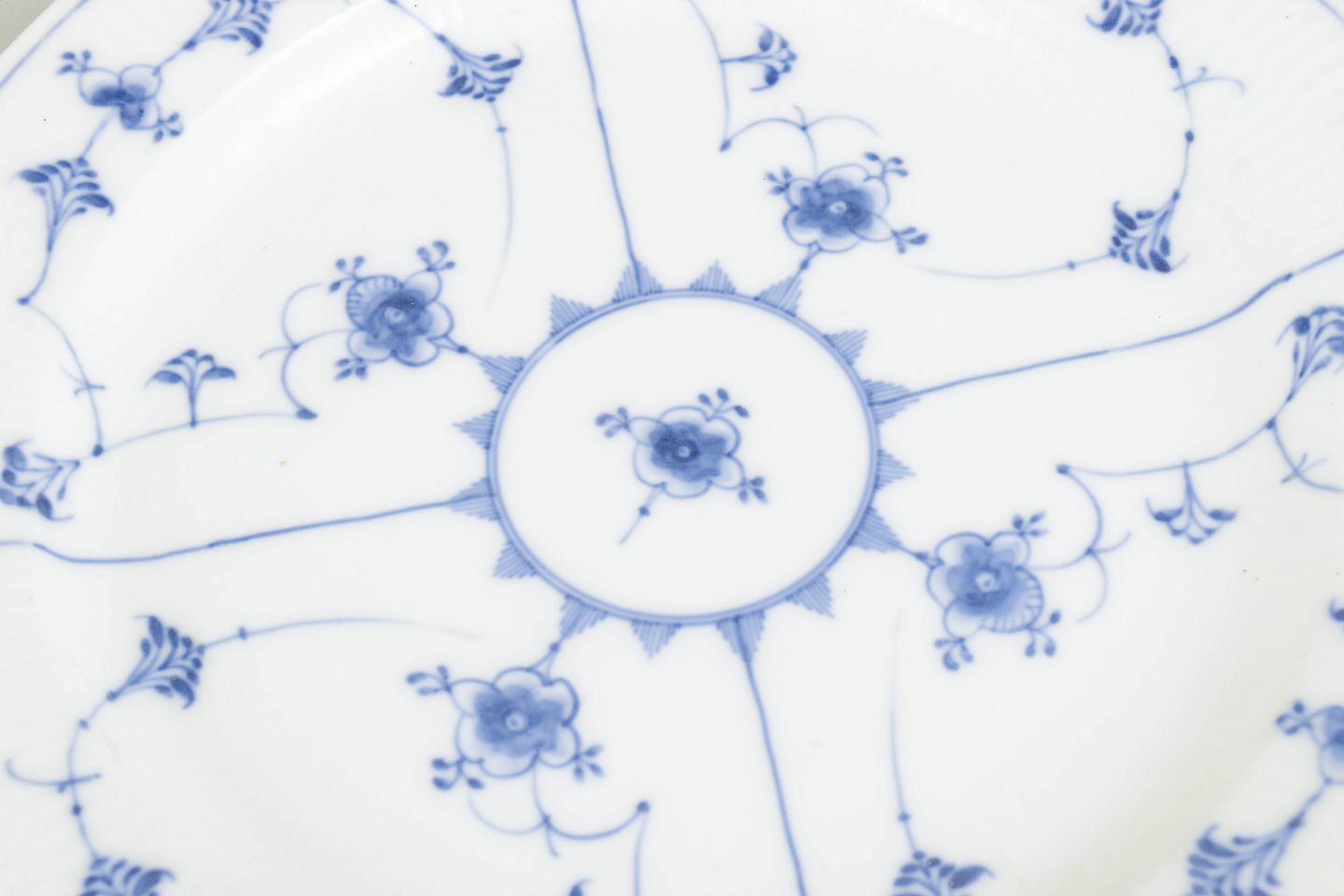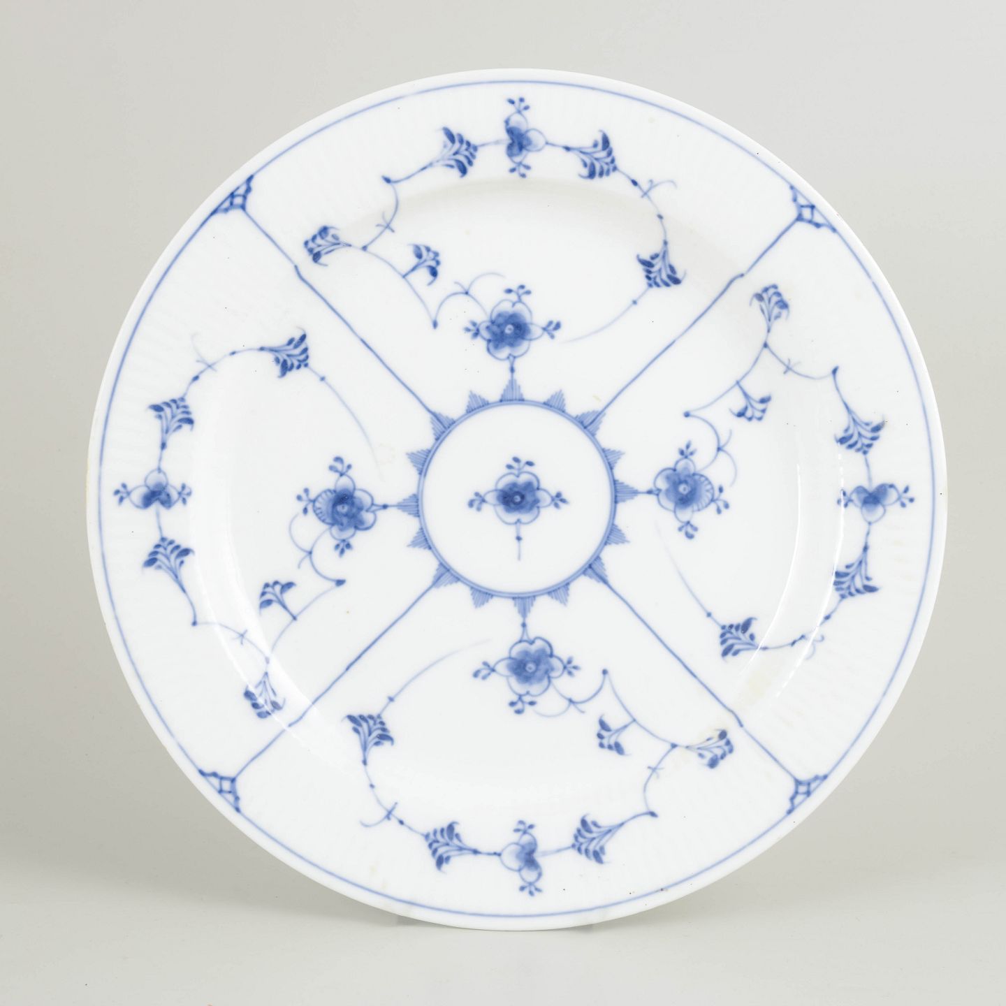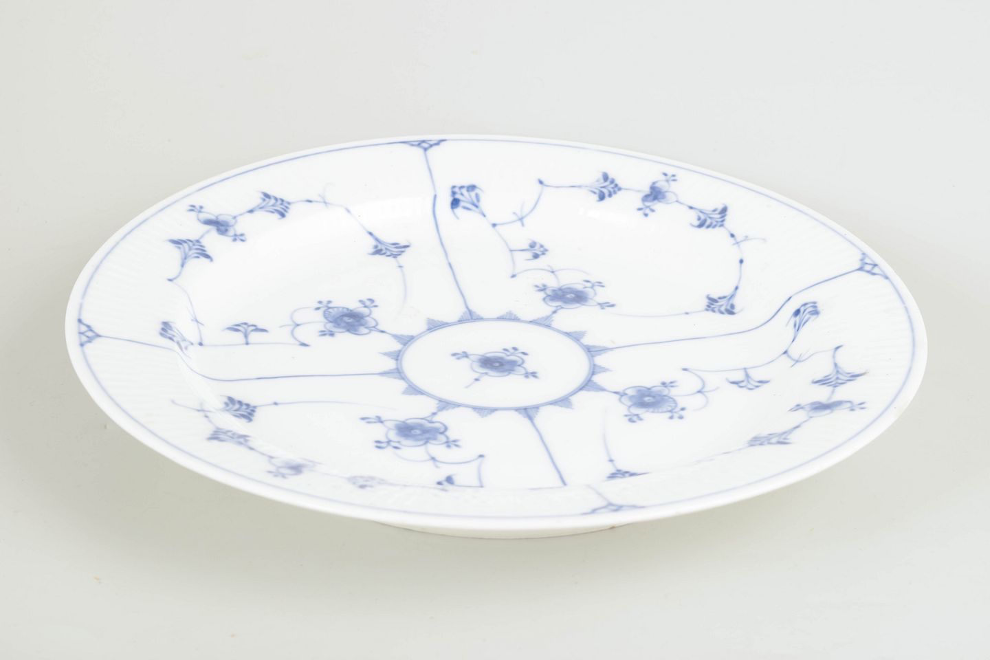 Musselmalet riflet blev introduceret i 1775 og regnes som Royal Copenhagens ældste og mest ikoniske stel. De tidligste dele fra slutningen af 1700-tallet og begyndelsen af 1800-tallet er kendetegnet ved en særlig finesse i bemaling og proportioner. Store fade som dette indgik i det repræsentative middagsbord og er i dag sjældne og eftertragtede samlerobjekter.