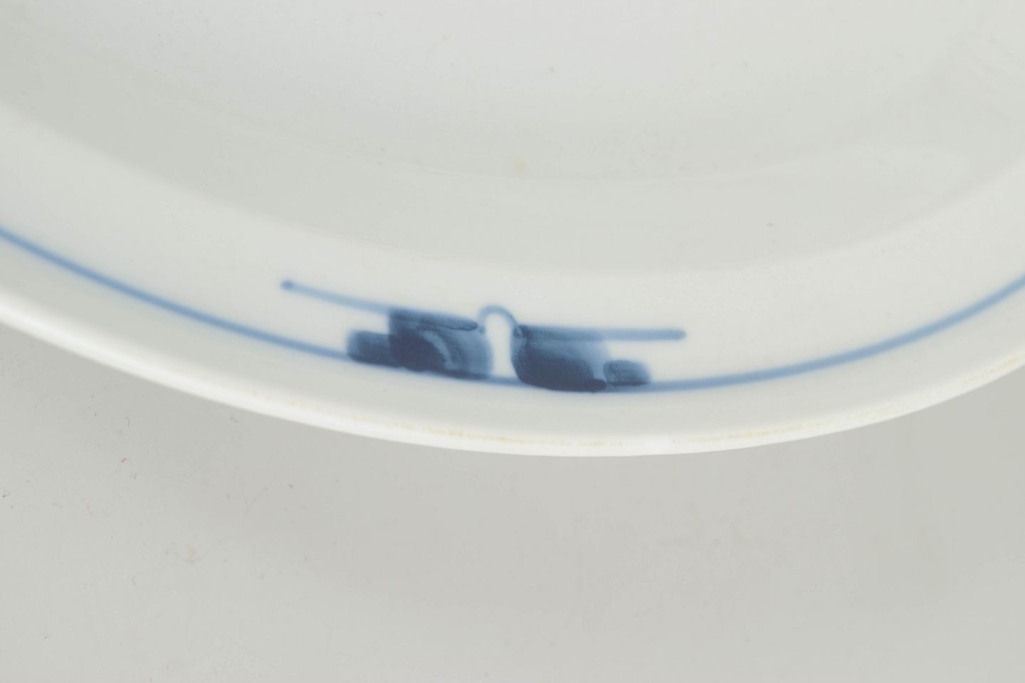 Stort serveringsfad i Gemina-stellet, udført i hvidt porcelæn med diskret, grafisk dekoration i blå underglasur. Den stramme, næsten arkitektoniske form understreger stellets modernistiske udtryk og gør fadet velegnet til servering og præsentation.