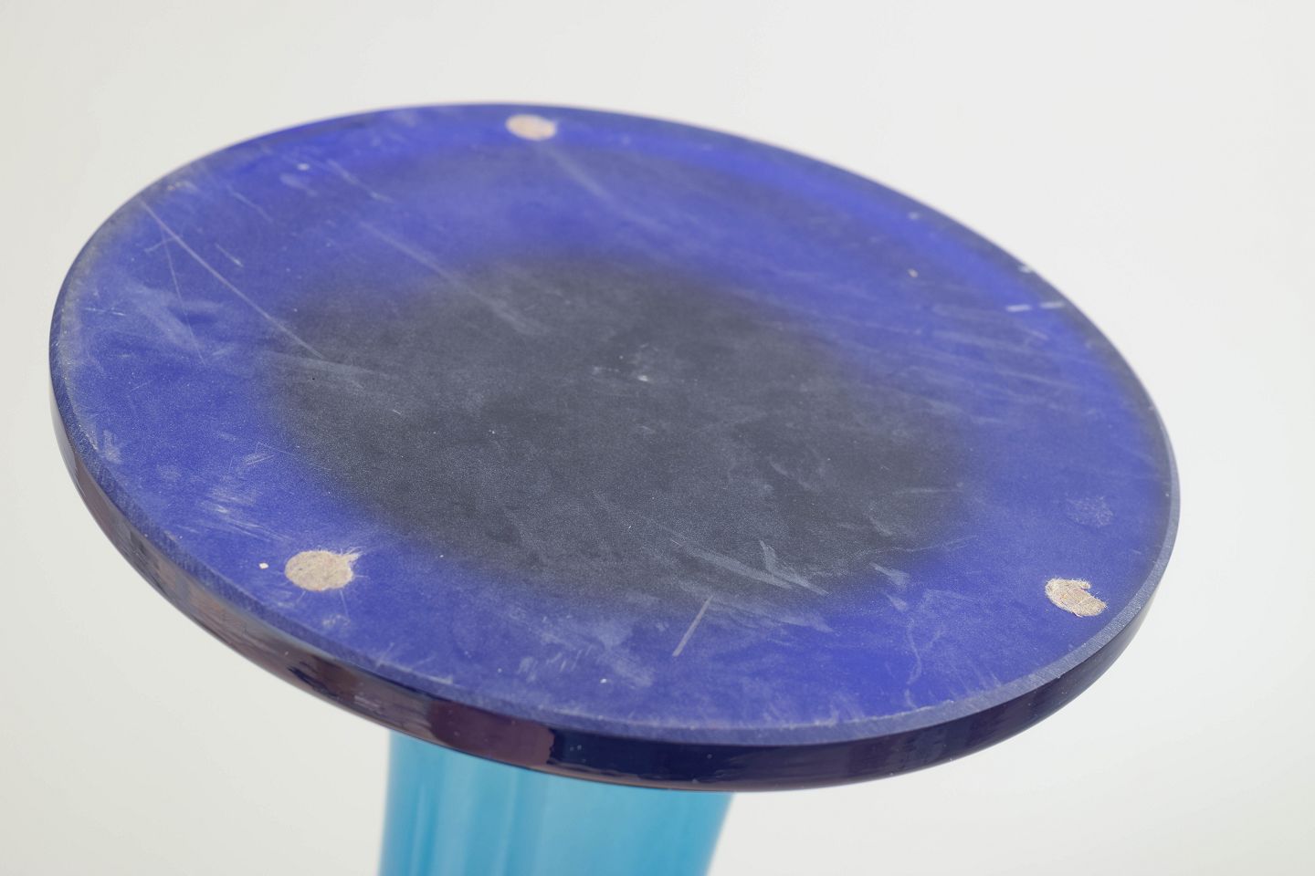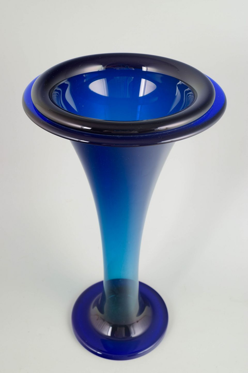 Monumental trompetformet vase i mundblæst, tungt krystalglas med dyb blå farvegraduering. En markant Art Deco-model med kraftig fod, slank stamme og bred, udadbøjet munding.