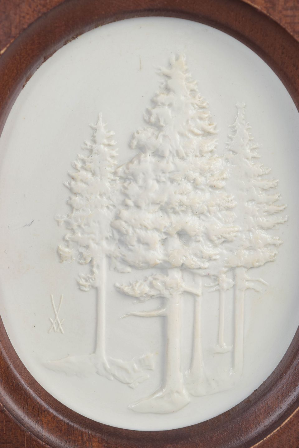Reliefplakette i hvid biscuit porcelæn med stiliseret naturmotiv forestillende træer, monteret i rektangulær træramme med ovalt udsnit. Den matte overflade fremhæver relieffets fine modellering og giver et klassisk, skulpturelt udtryk.
