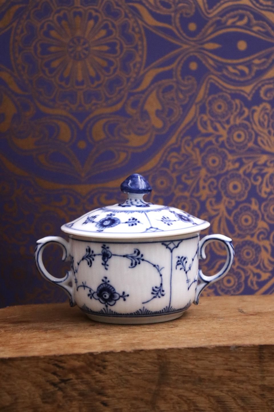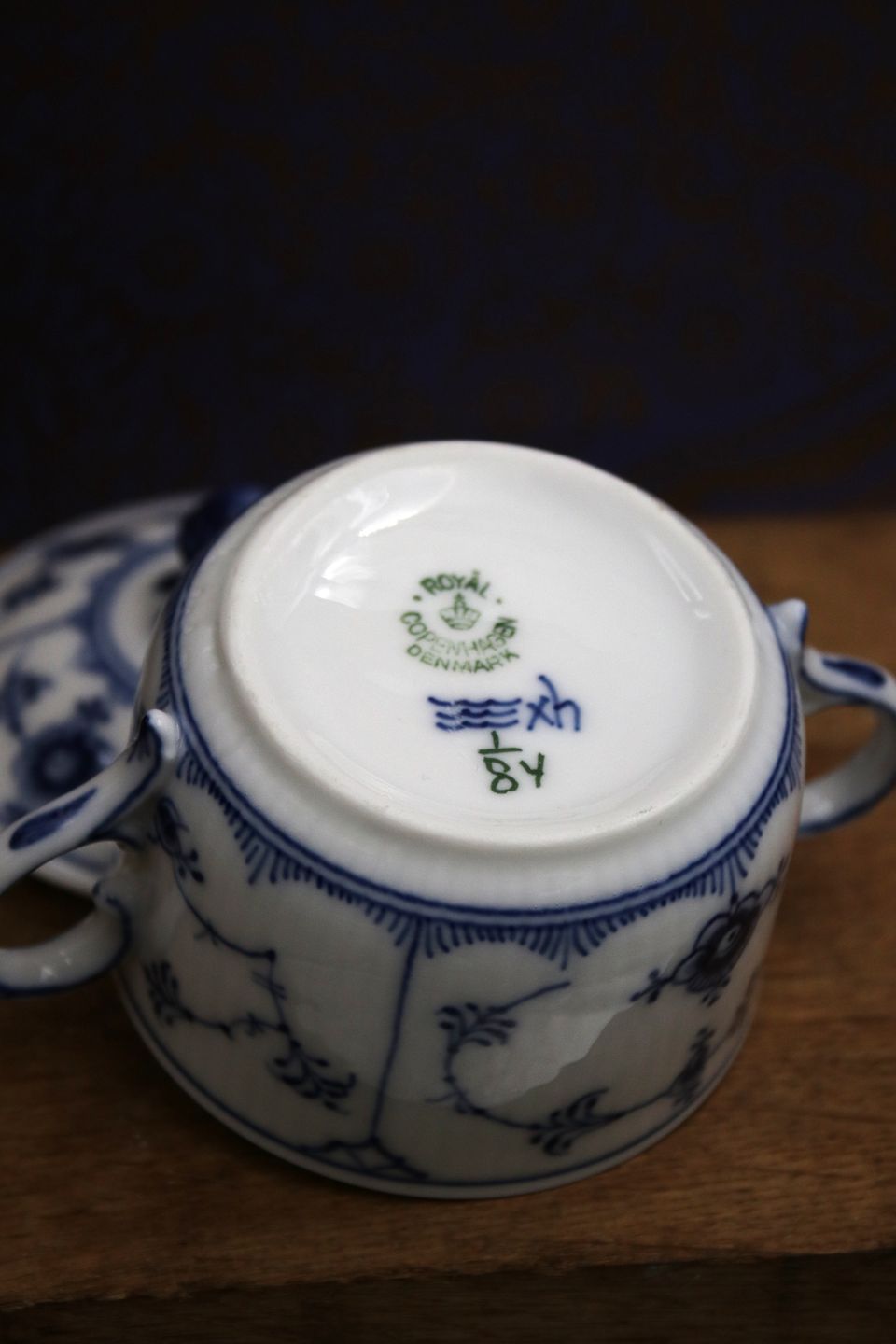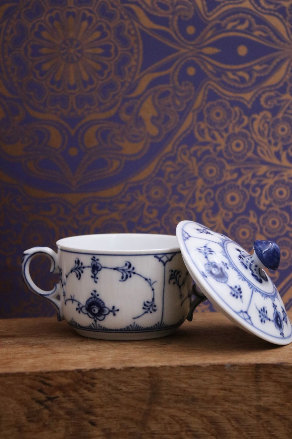 Royal Copenhagen Musselmalet Riflet bouillon kop med hanke og låg.