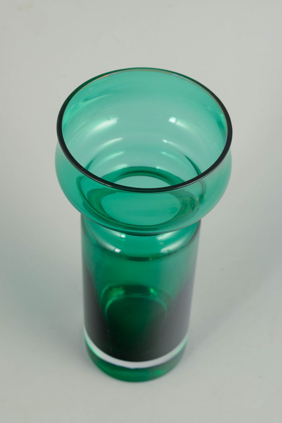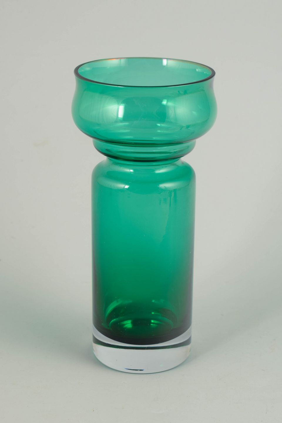 Elegant vase i klart turkisgrønt glas med balanceret, skulpturel profil og blød, rundet form. Mundblæst udførelse med markeret skålformet overdel og cylindrisk underdel, typisk for finsk kunstglas fra 1970’erne.