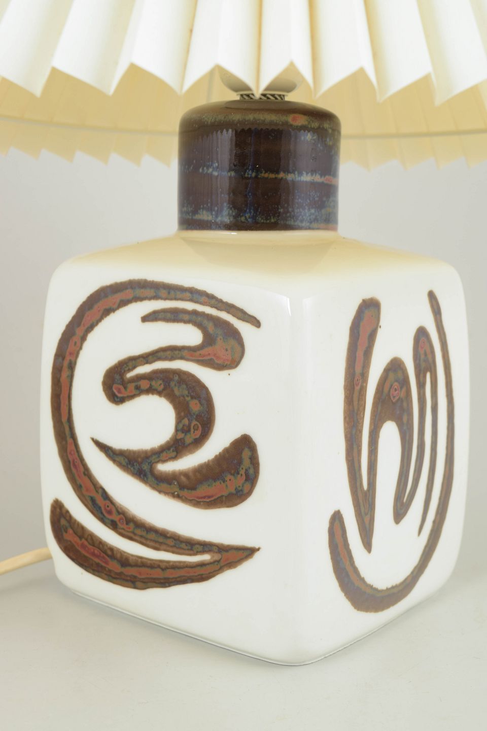 Keramisk bordlampe i stentøj med hånddekoreret relief i brune og sorte toner på hvid bund. Kvadratisk lampefod med grafisk, orientalsk inspireret ornamentik. Original plisseret Le Klint skærm. Et markant eksempel på svensk modernisme og dansk design fra 1960’erne.