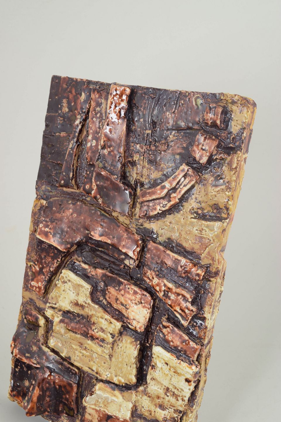 Abstrakt, brutalistisk vægrelief i stentøj med kraftig, struktureret overflade og reliefornamentik. Naturlige jordfarver i creme, okker og brune nuancer. Unikt, håndlavet værk, signeret.