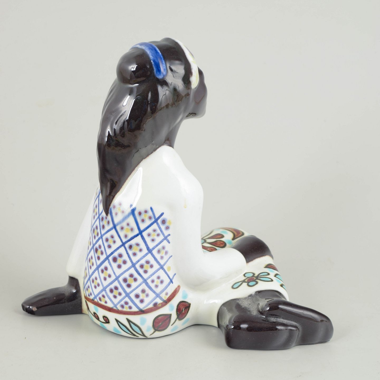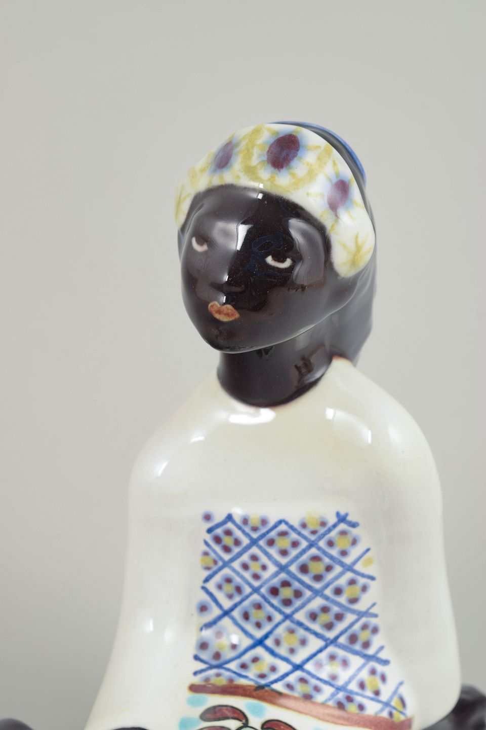 Håndmalet figur i fajance forestillende siddende kvinde, dekoreret med polykrome mønstre samt grafiske og folkloristiske detaljer. Et karakteristisk eksempel på Mari Simmulsons figurative formsprog fra perioden.