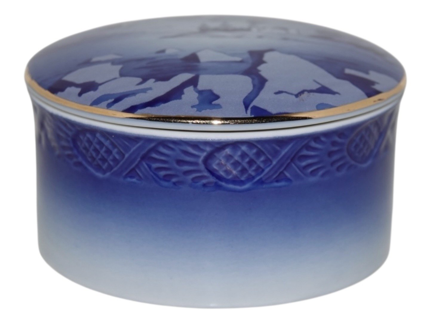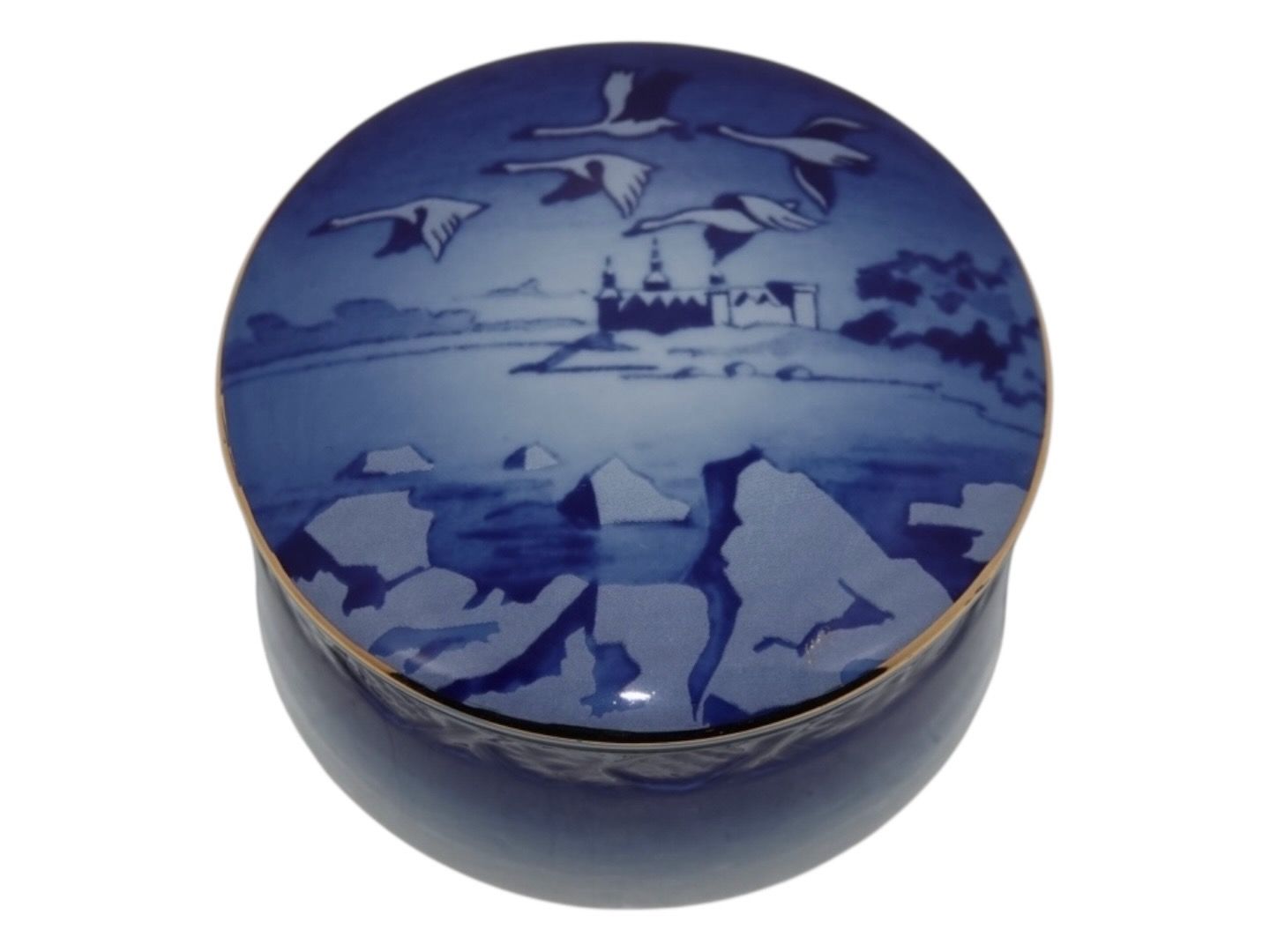 Royal Copenhagen lille mørkeblå bonbonniere med Kronborg Slot.