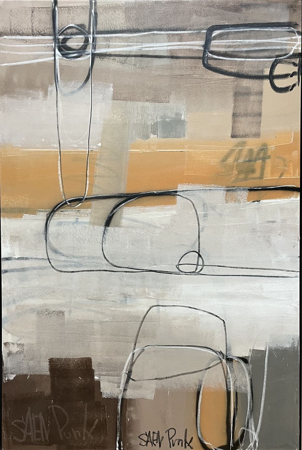 "Komposition" Oliemaleri på lærred, monteret i sølv svæveramme.