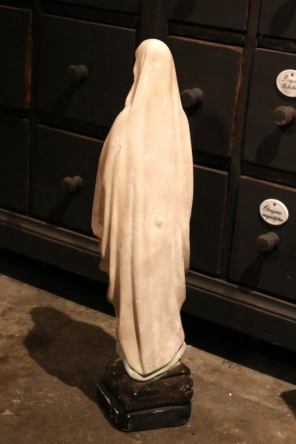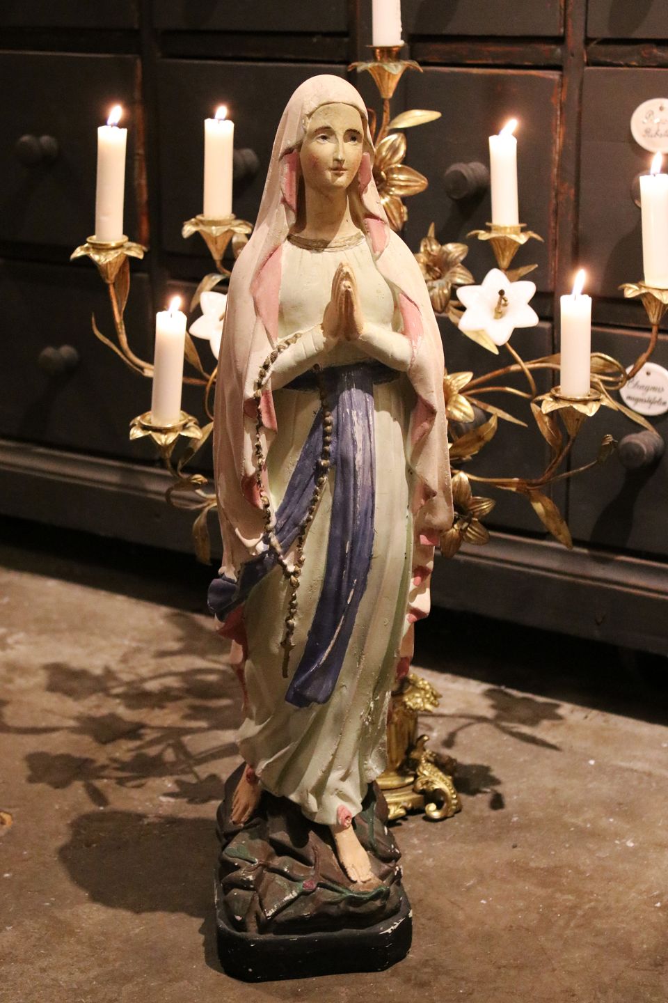 Stor , gammel fransk Madonna figur i gips med fin gammel bemaling og fin patina...