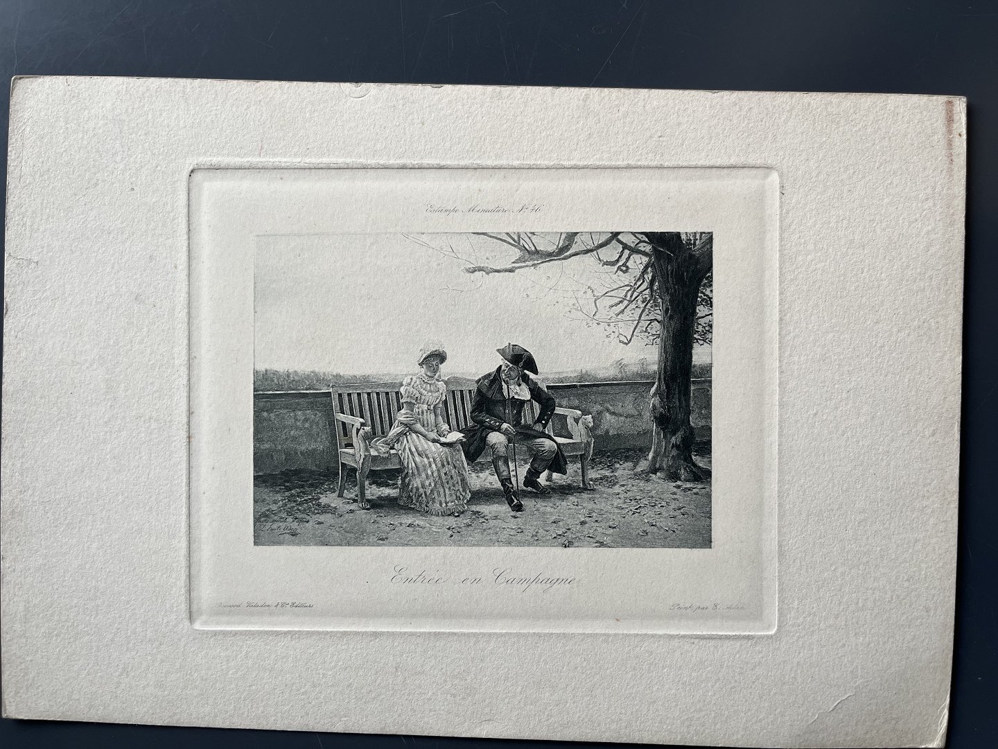 Radering af Louis-Emile Adan 1886 - En ældre mand kurtiserer en yngre dame på bænk-