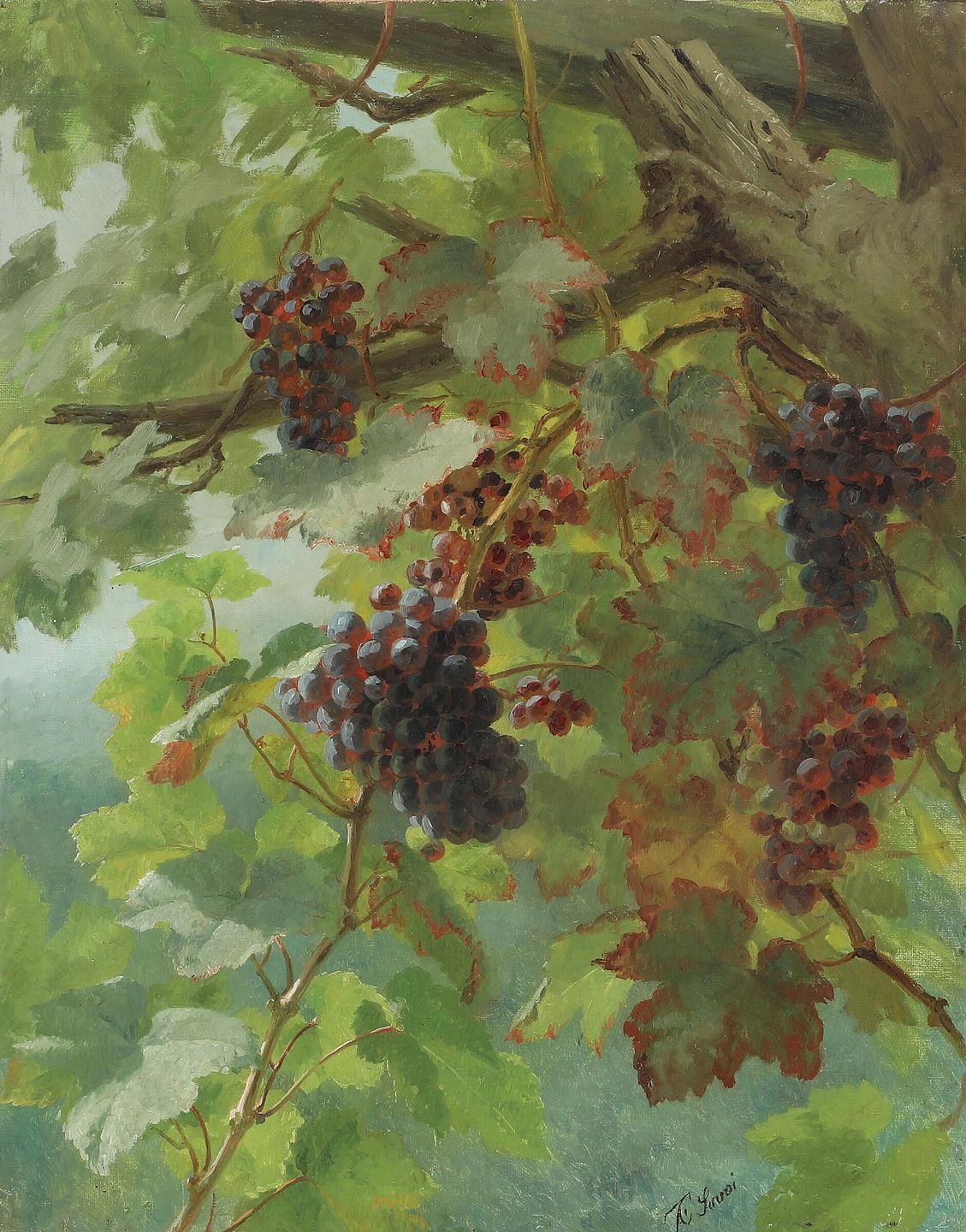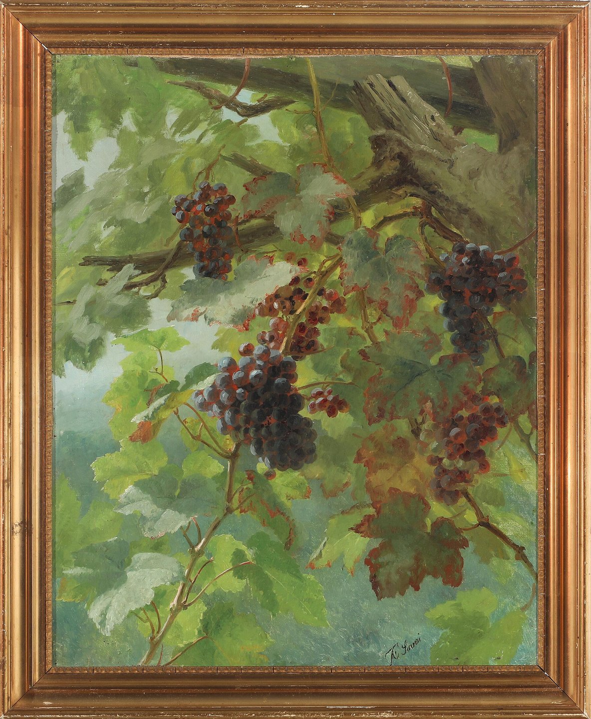 "Blå vindruer" maleri i forgyldt ramme, maleriet er med forstærket lærred.