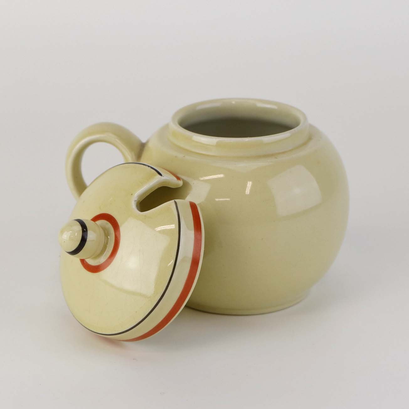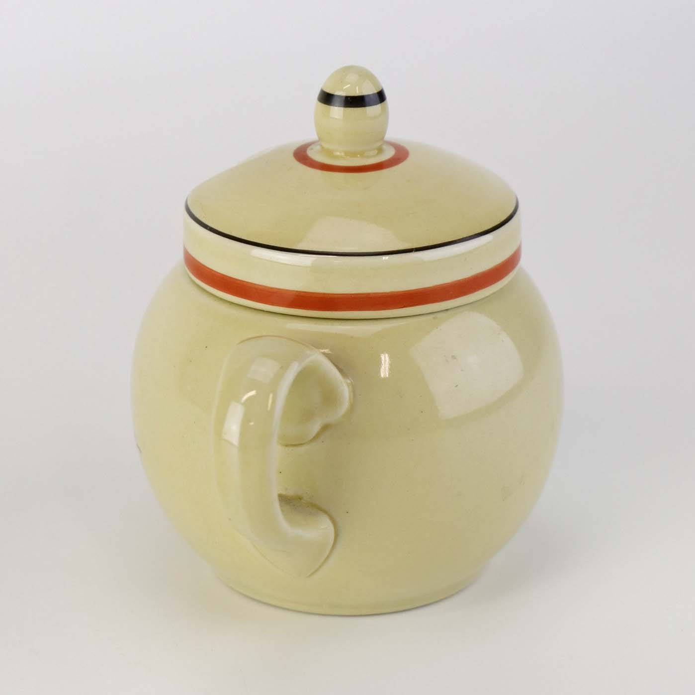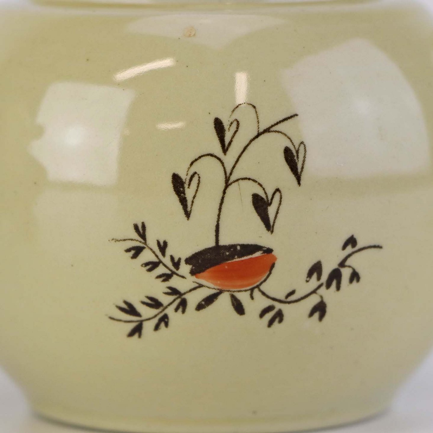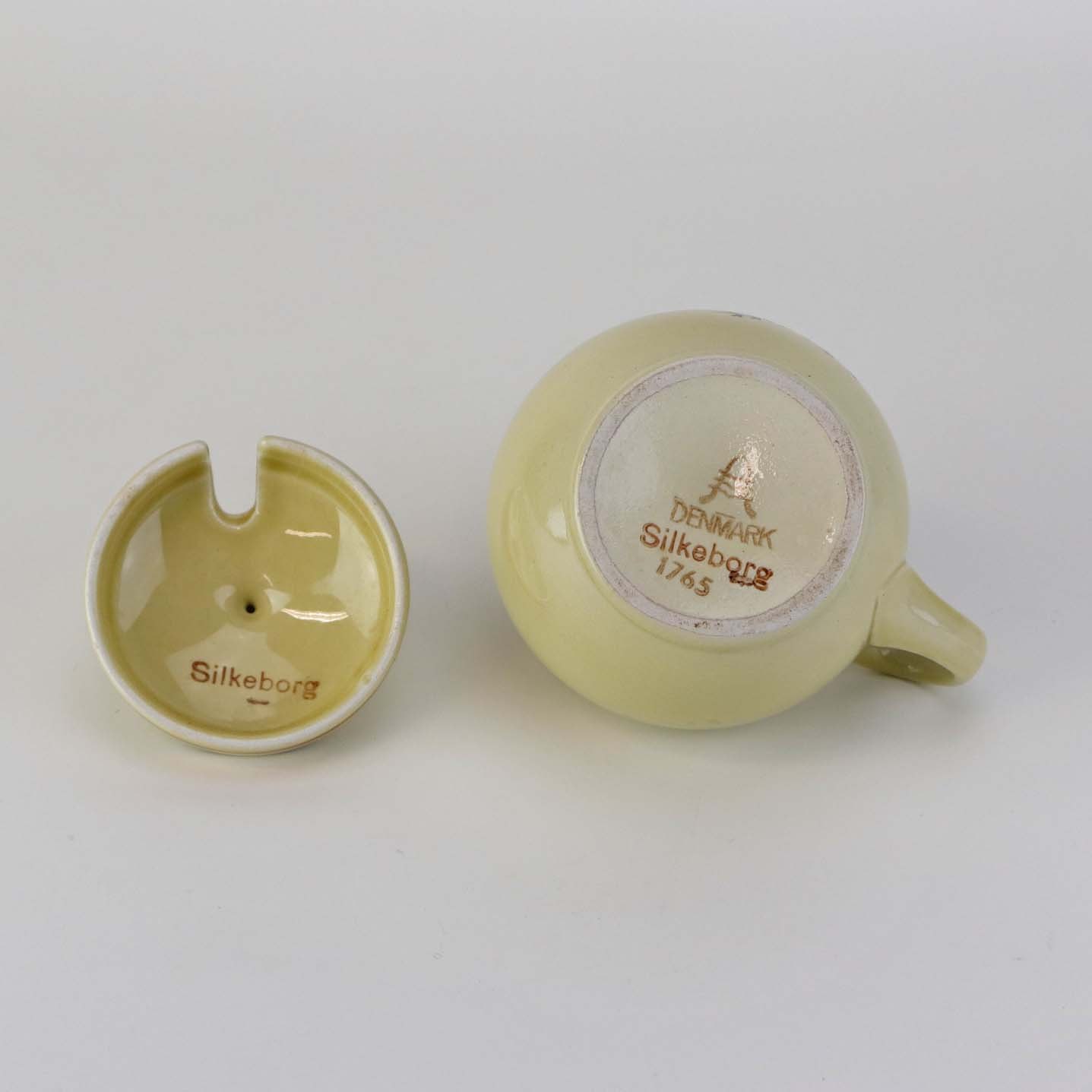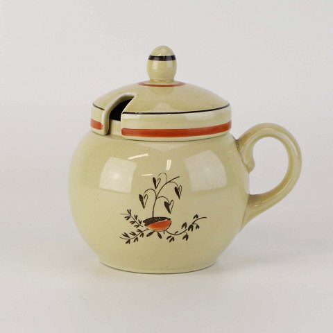 Kop med låg og hank til sennep i fajance fra stellet Silkeborg fremstillet i perioden 1937-1939. Nr. 1765